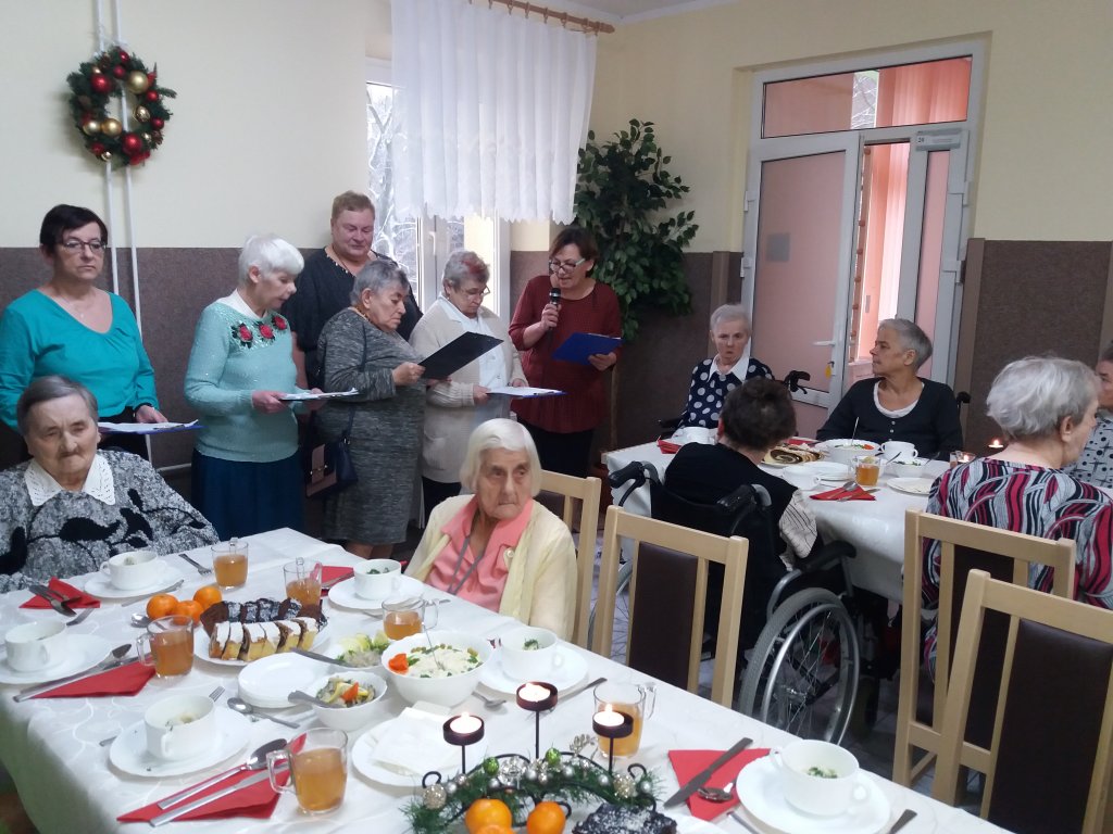 Dyrektor Izabela Misiak przywitała wszystkich zebranych przy wigilijnym stole. Mieszkanki naszego Domu przedstawiły Jasełka. Następnie dyrektor poprosiła o zabranie głosu kolejno starostę Macieja Romanowskiego, dyrektora PCPR-u Tomasza Domżalskiego oraz proboszcza Janusza Niksę.
