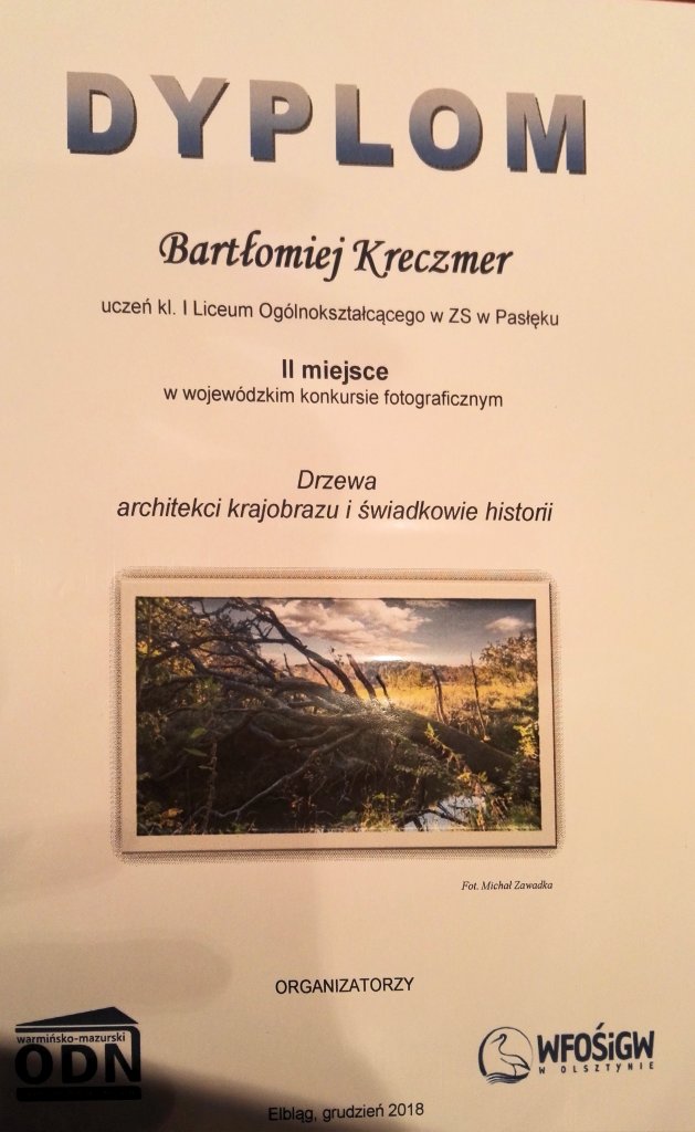 Został rozstrzygnięty wojewódzki konkurs fotograficzny pt. „Drzewa architekci krajobrazu i świadkowie historii” i jest nam niezmiernie miło poinformować, że drugie miejsce zajął Bartłomiej Kreczmer, uczeń klasy 1a LO Zespołu Szkół w Pasłęku.