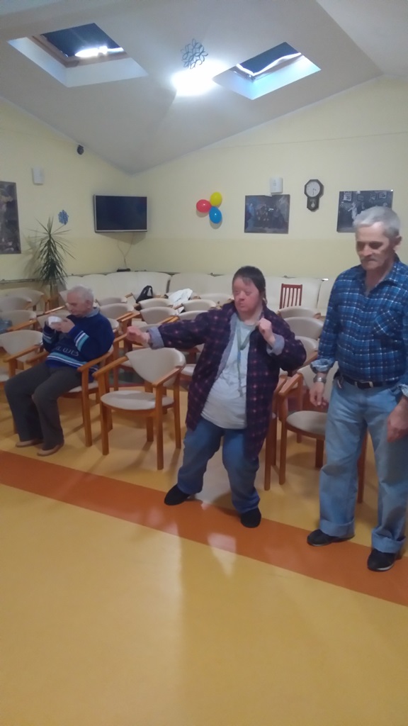 Również tego dnia w godzinach popołudniowych wybraliśmy się z mieszkańcami na ostatnia karnawałową zabawę do Domu Pomocy Społecznej „ NIEZAPOMINAJKA” w Elblągu, gdzie personel domu wraz z mieszkańcami swoim corocznym występem wprowadzili wszystkich gości w dobry humor. Zostaliśmy ugoszczeni pysznym ciastem oraz pączkami. Następnie udaliśmy się na hol gdzie wspólnie z innymi zaproszonymi gośćmi bawiliśmy się w rytmach teraźniejszych przebojów jak i tych nieco starszych. Z zabawy wróciliśmy zadowoleni.