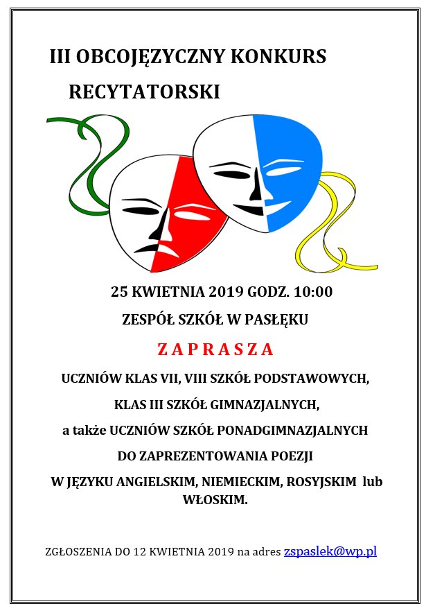 W dniu 25 kwietnia 2019 o godz. 10:00 w auli Zespołu Szkół w Pasłęku odbędzie się III Obcojęzyczny Konkurs Recytatorski. W konkursie udział brać mogą uczniowie klas VII i VIII szkół podstawowych, klas III szkół gimnazjalnych, a także uczniowie szkół ponadgimnazjalnych.