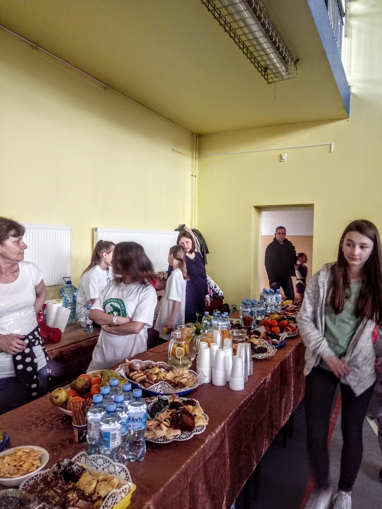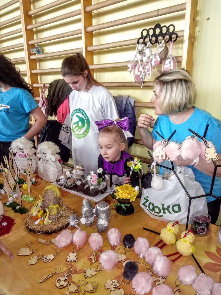 Wychowawcy z Marwicy przygotowali i kusili przekąskami fit i owocami. Były też zabawy dla dzieci: malowanie twarzy, jedzenie jabłka na czas, zabawy z hula-hopem i wiele innych ciekawych gier. Członkowie Stowarzyszenia przygotowali również wystawę rękodzieła o tematyce wielkanocnej. Trzy godziny minęły niepostrzeżenie i kosztowały... wiele spalonych kalorii.
