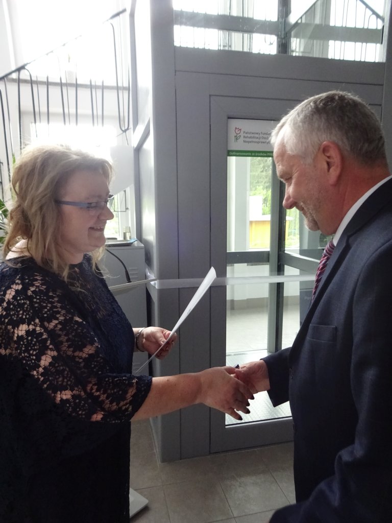 Serdeczne podziękowania złożyła radnym powiatu ze starostą na czele, dyrektorowi Oddziału Warmińsko-Mazurskiego PFRON w Olsztynie, pracownikom Starostwa Powiatowego w Elblągu, dyrektorowi i pracownikom PCPR w Elblągu, burmistrzowi Pasłęka oraz wykonawcy zadania budowy windy.