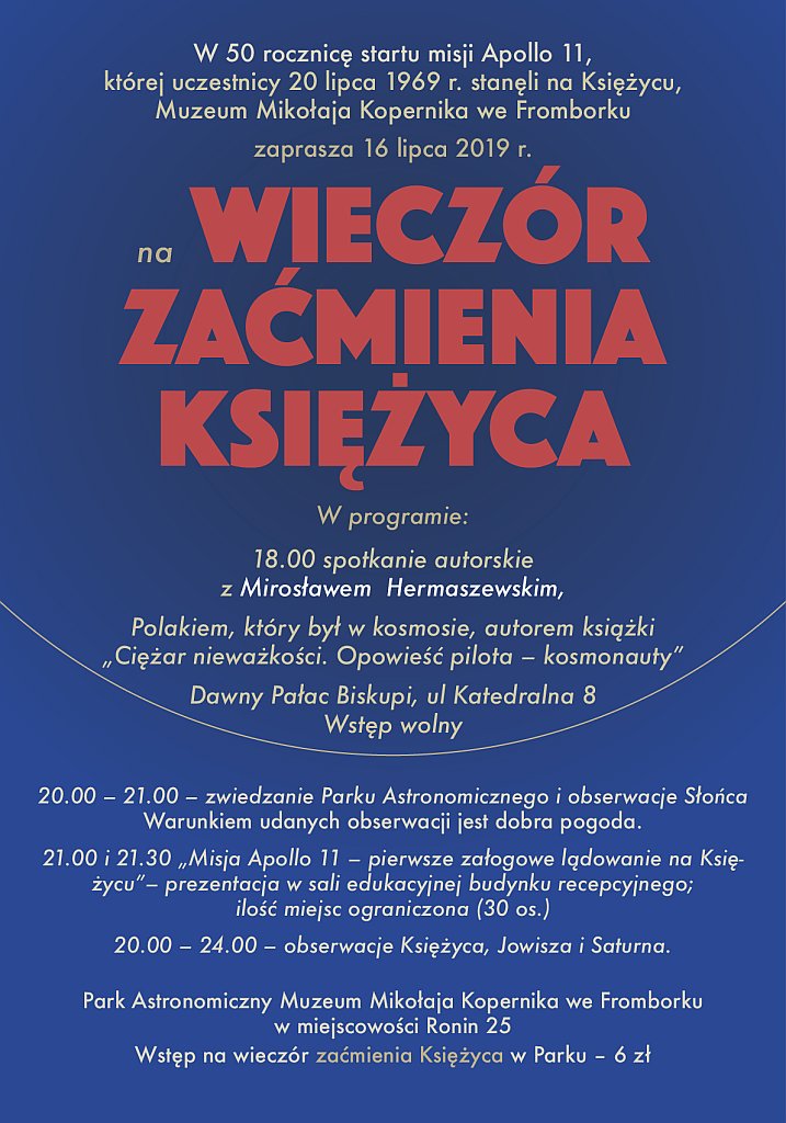 We wtorek 16 lipca 2019 roku, w 50. rocznicę startu misji Apollo 11, wieczór zaćmienia księżyca, serdecznie zapraszamy na spotkanie autorskie z Mirosławem Hermaszewskim, Polakiem, który był w kosmosie, autorem książki "Ciężar nieważkości. Opowieść pilota - kosmonauty". Wstęp wolny.