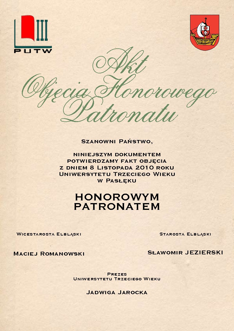 Dnia 9 Listopada 2010 r. na posiedzeniu Zarządu Powiatu w Elblągu podpisane zostało porozumienie w zakresie objęcia patronatem Starosty Elbląskiego działalności Pasłęckiego Uniwersytetu Trzeciego Wieku.