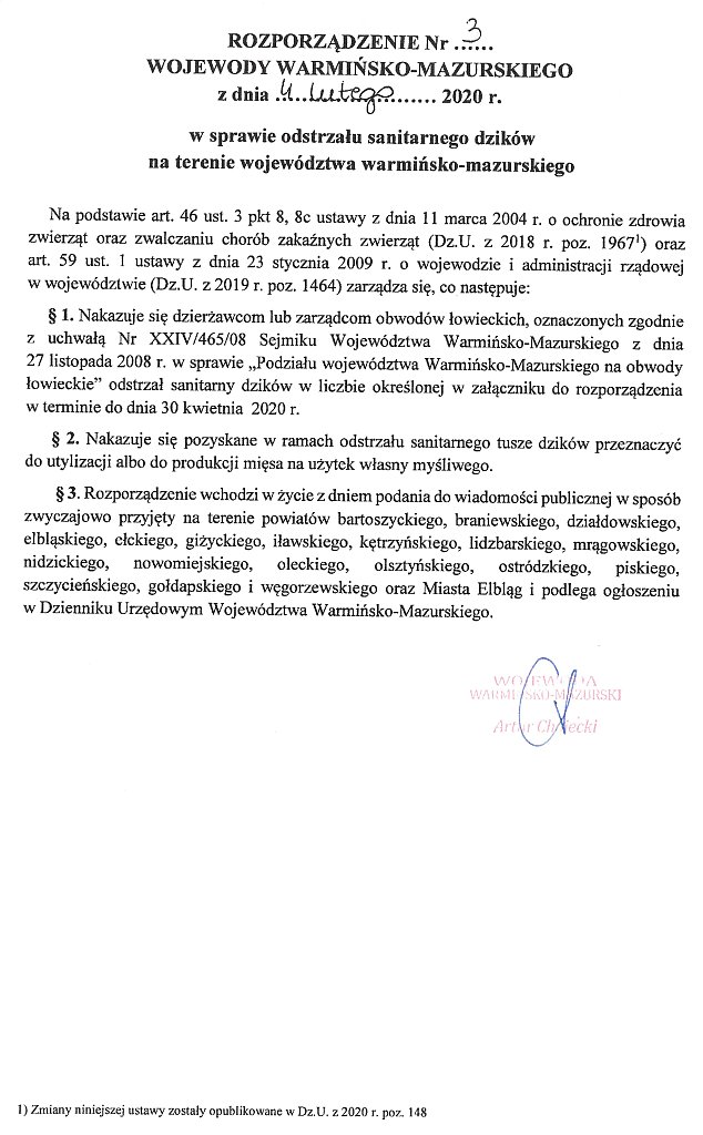 Wojewoda Warmińsko-Mazurski w dniu 4 lutego 2020 roku wydał Rozporządzenie Nr 3 w sprawie odstrzału sanitarnego dzików na terenie województwa warmińsko-mazurskiego. Zgodnie z ww. rozporządzeniem nakazuje się dzierżawcom lub zarządcom obwodów łowieckich odstrzał sanitarny dzików. Pozyskane w ramach odstrzału tusze dzików należy przeznaczyć do utylizacji lub do produkcji mięsa na użytek własny myśliwego.