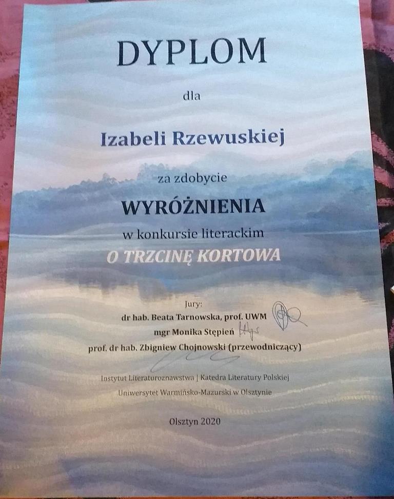 Na konkurs Izabela wysłała trzy utwory poetyckie: ,,Kubek", ,,Zatracenie" i ,, Wspomnienie nocy", które zostały wysoko ocenione m. in. przez prof. dra hab. Zbigniewa Chojnowskiego - dyrektora Instytutu Literaturoznawstwa UWM, panie mgr Monikę Stępień i dr hab. Beatę Tarnowską – pracownika naukowego UWM.
