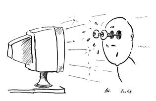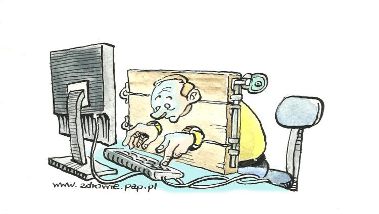 2. Osoba przy komputerze powinna siedzieć tak, by mniej więcej górna krawędź monitora znajdowała się na wysokości jego wzroku. Stopy powinny dotykać podłoża całą swoją powierzchnią a kolana powinny być ugięte pod kątem prostym. Oparcie fotela należy dopasować do kształtu pleców.