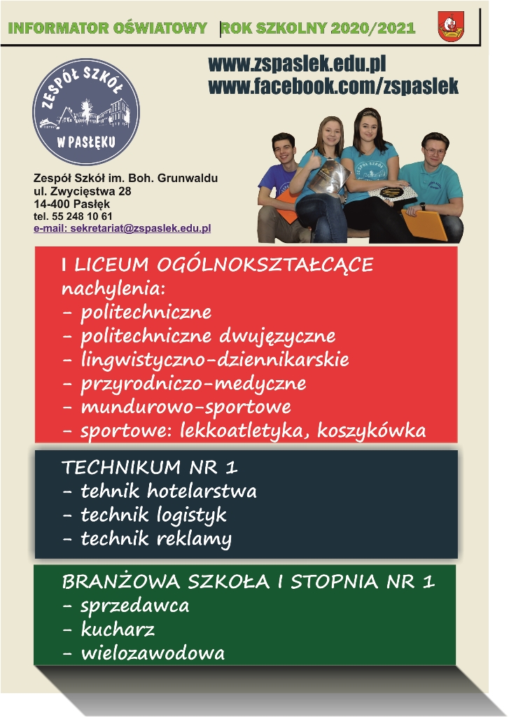 Zachęcamy do zapoznania się z poniższą ofertą. Dzisiaj przedstawiamy ofertę Zespołu Szkół w Pasłęku