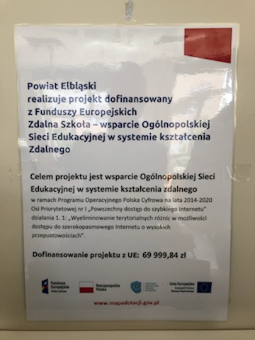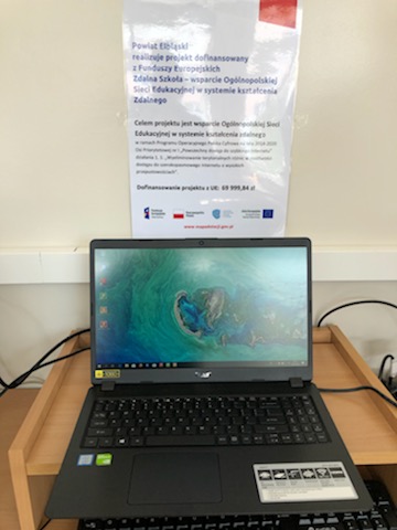 Zespół Szkół Ekonomicznych i Technicznych otrzymał laptopy zakupione przez Powiat Elbląski w ramach realizacji projektu grantowego p.n. „Zdalna Szkoła – wsparcie Ogólnopolskiej Sieci Edukacyjnej w systemie kształcenia zdalnego” współfinansowanego ze środków Europejskiego Funduszu Rozwoju Regionalnego w ramach Programu Operacyjnego Polska Cyfrowa na lata 2014-2020.