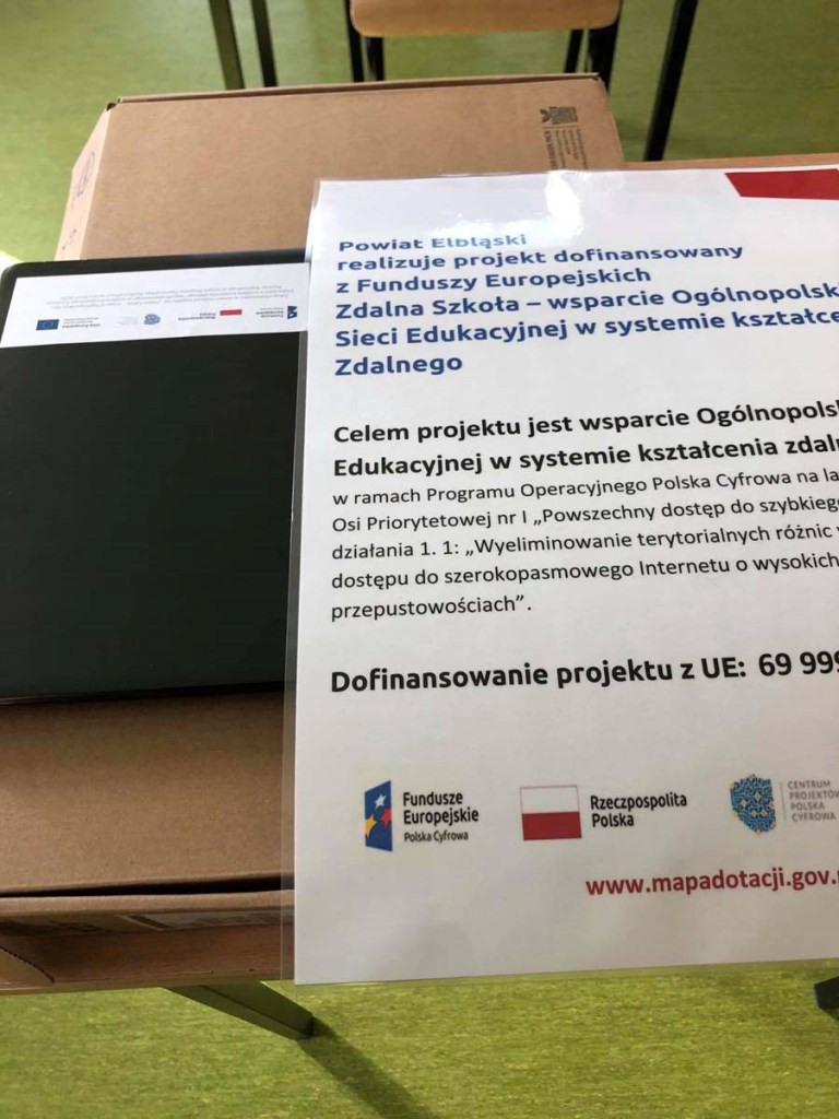 Działanie w całości zostało sfinansowane ze środków Europejskiego Funduszu Rozwoju Regionalnego w ramach Programu Operacyjnego Cyfrowa Polska na lata 2014 – 2020, Oś I Powszechny dostęp do szybkiego internetu, Działanie 1.1 Wyeliminowanie terytorialnych różnic w możliwości do szerokopasmowego internetu o wysokich przepustowościach „Zdalna Szkoła – wsparcie Ogólnopolskiej Sieci Edukacyjnej w systemie kształcenia zdalnego”.