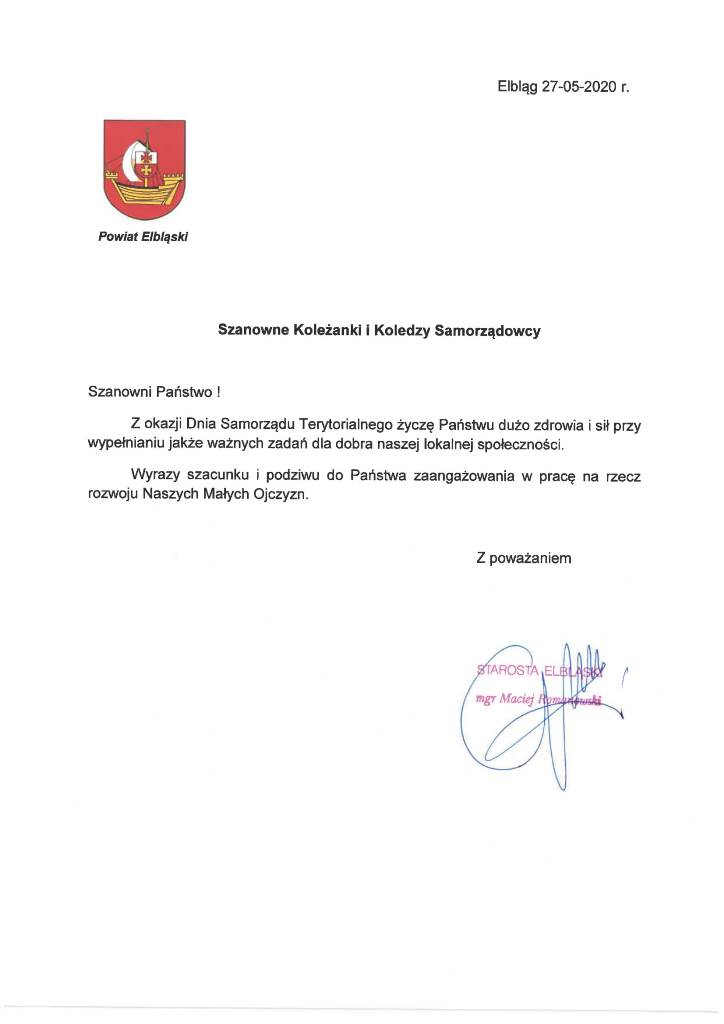 Życzenia Starosty Elbląskiego z okazji Dnia Samorządu Terytorialnego