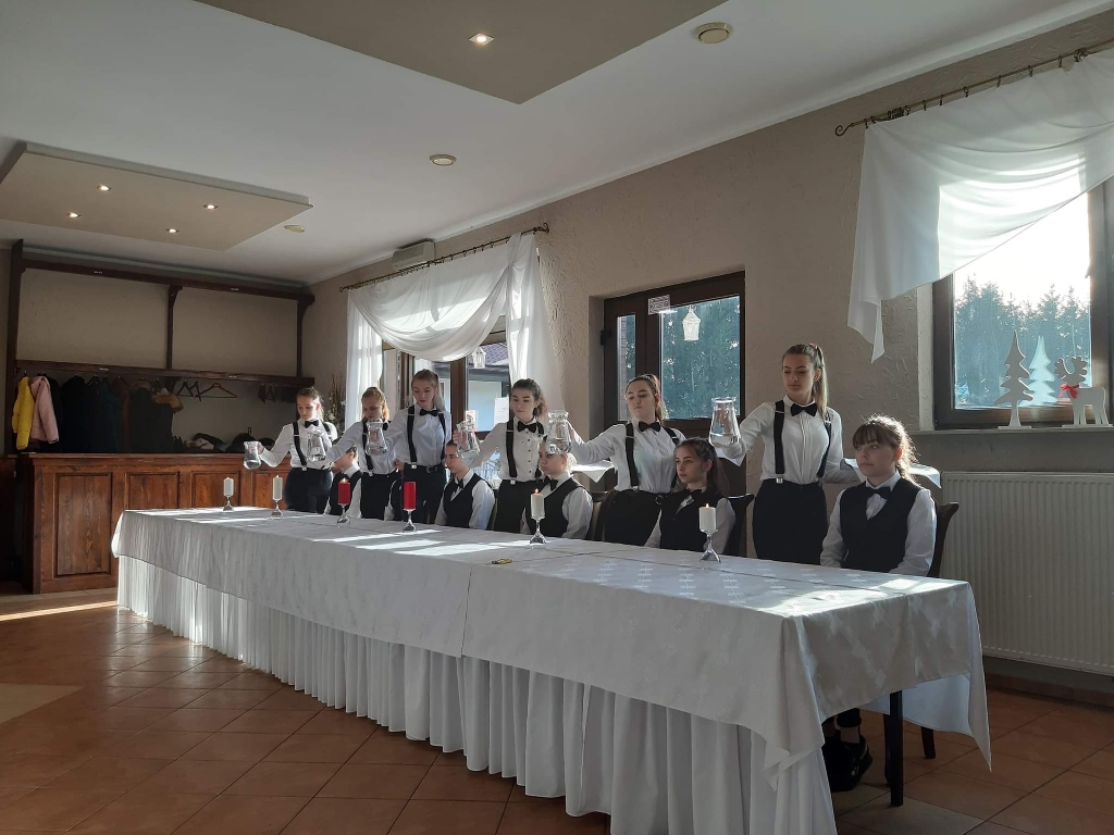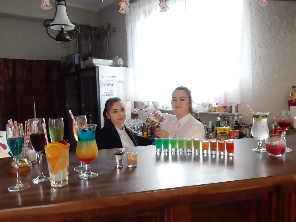 Pierwszy z nich, kurs kelner-barman odbył się na przełomie stycznia i lutego 2020 r. Jego celem było zapoznanie uczniów z zasadami rozliczeń kelnerskich, sposobami sporządzania oraz podawania potraw i napojów, planowaniem wyżywienia i obsługą przyjęć okolicznościowych. Podczas kursu uczniom przekazano informacje na temat wyposażenia barów w sprzęt i urządzenia, różnych form zaopatrzenia barów w towary handlowe i produkty żywnościowe oraz metod ich oceny i przechowywania oraz organizacji pracy i czynności związanych z przygotowaniem baru do przyjęcia gości.