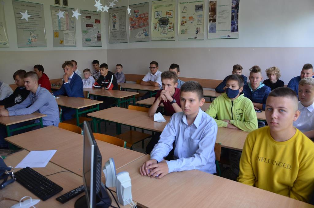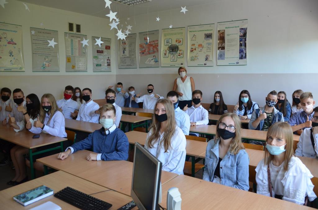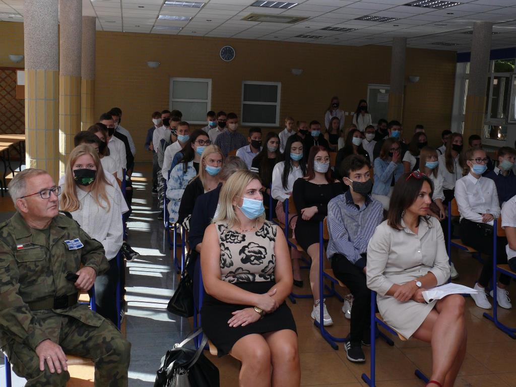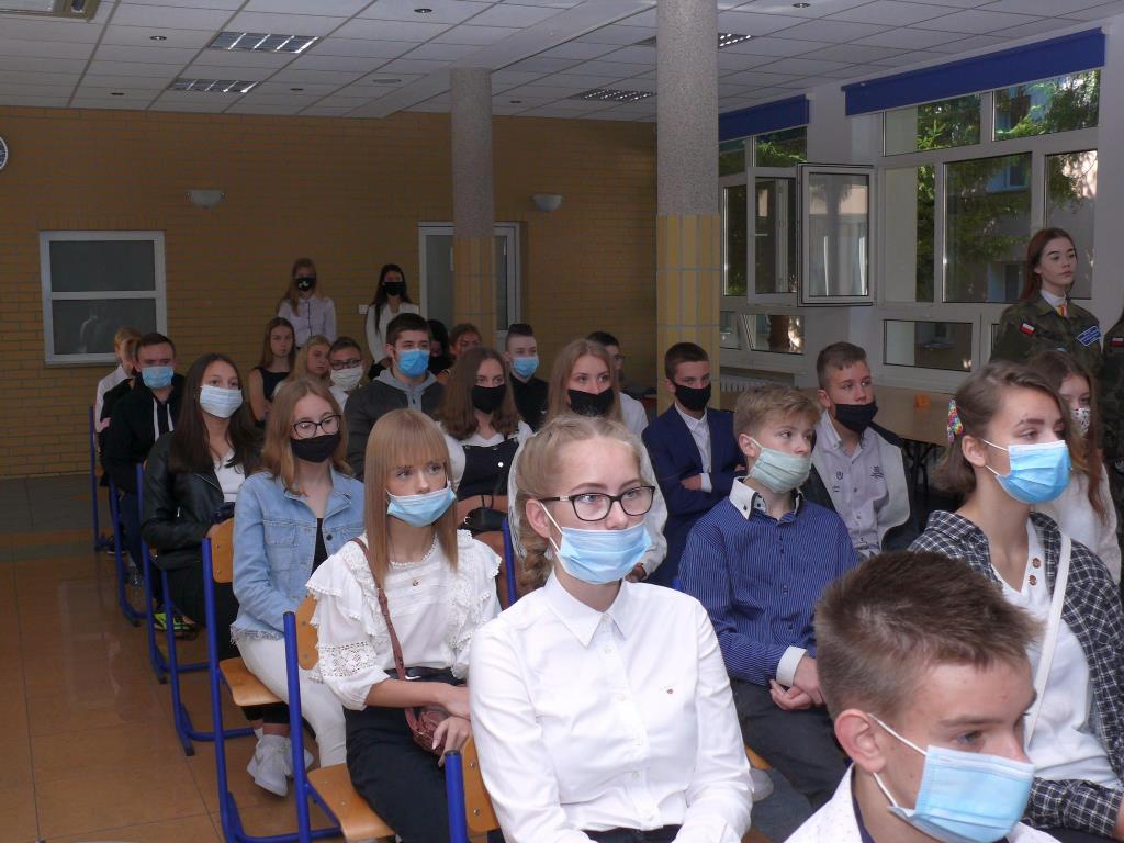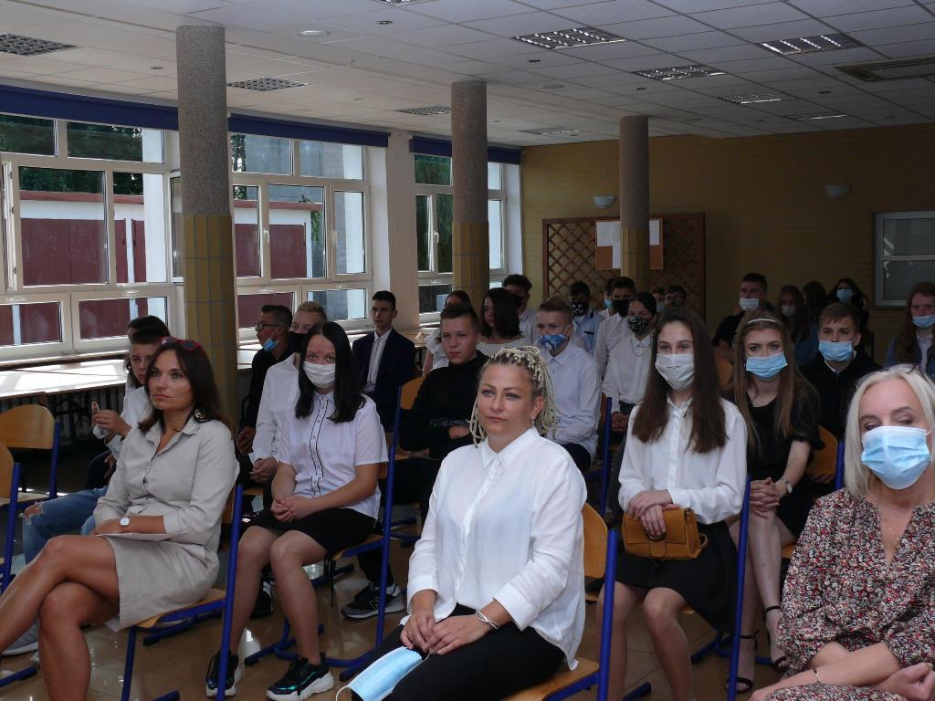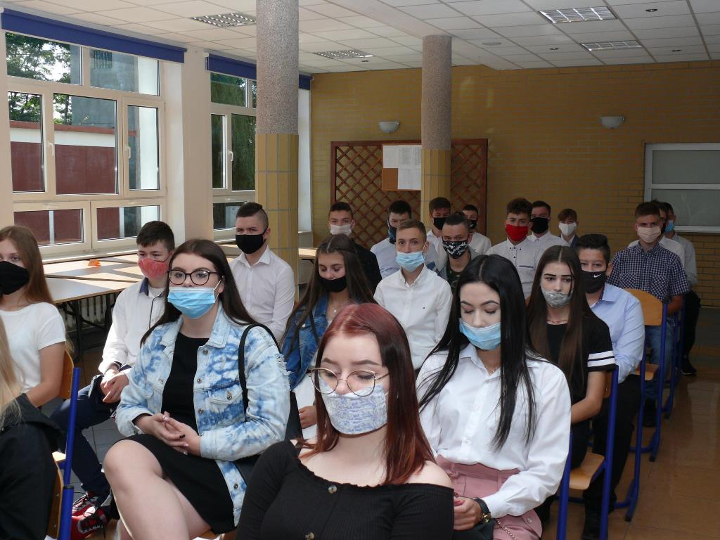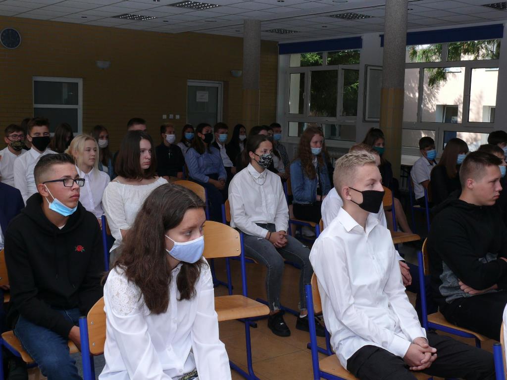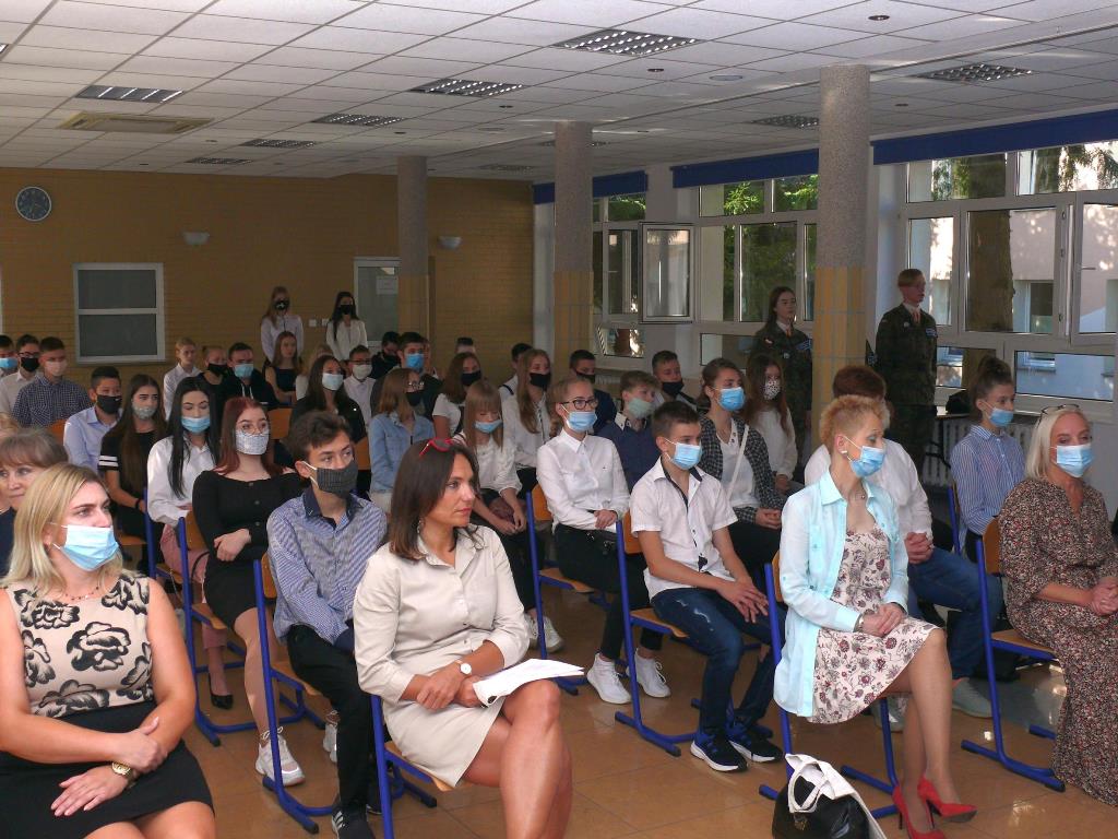 Przemawiający do młodzieży dyr. Marian Matuszczak oprócz ciepłych słów powitania, zwrócił także uwagę, że w bieżącym roku uczniowie będą musieli zmierzyć się nie tylko z nauką, ale również z przestrzeganiem zaleceń sanitarnych.