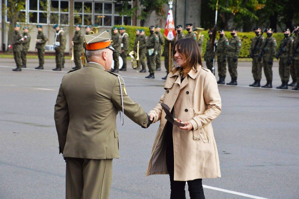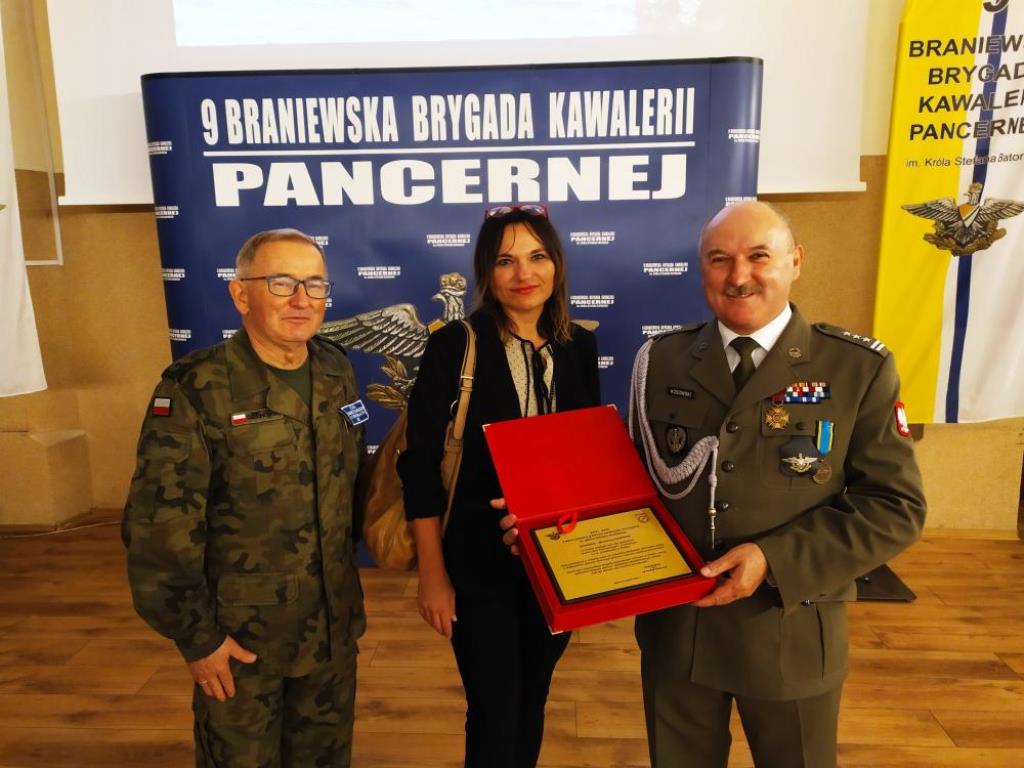 Po uroczystym wciągnięciu flagi narodowej na maszt i odśpiewaniu hymnu państwowego Dowódca wręczył żołnierzom i pracownikom Brygady medale i wyróżnienia. Natomiast za wsparcie kadetów ZSEiT w przeprowadzeniu Spartakiady Wojska Polskiego w Biegu na Orientację, której pierwszy etap, czyli tzw. sprint odbył się na Starówce w Pasłęku, wicedyrektor Zawarczyńska odebrała pamiątkowy medal Spartakiady Wojskowej. Był to też dobry moment na wręczenie Dowódcy 9 BBKPanc pamiątkowego ryngrafu wraz z życzeniami dla całego stanu osobowego Brygady.