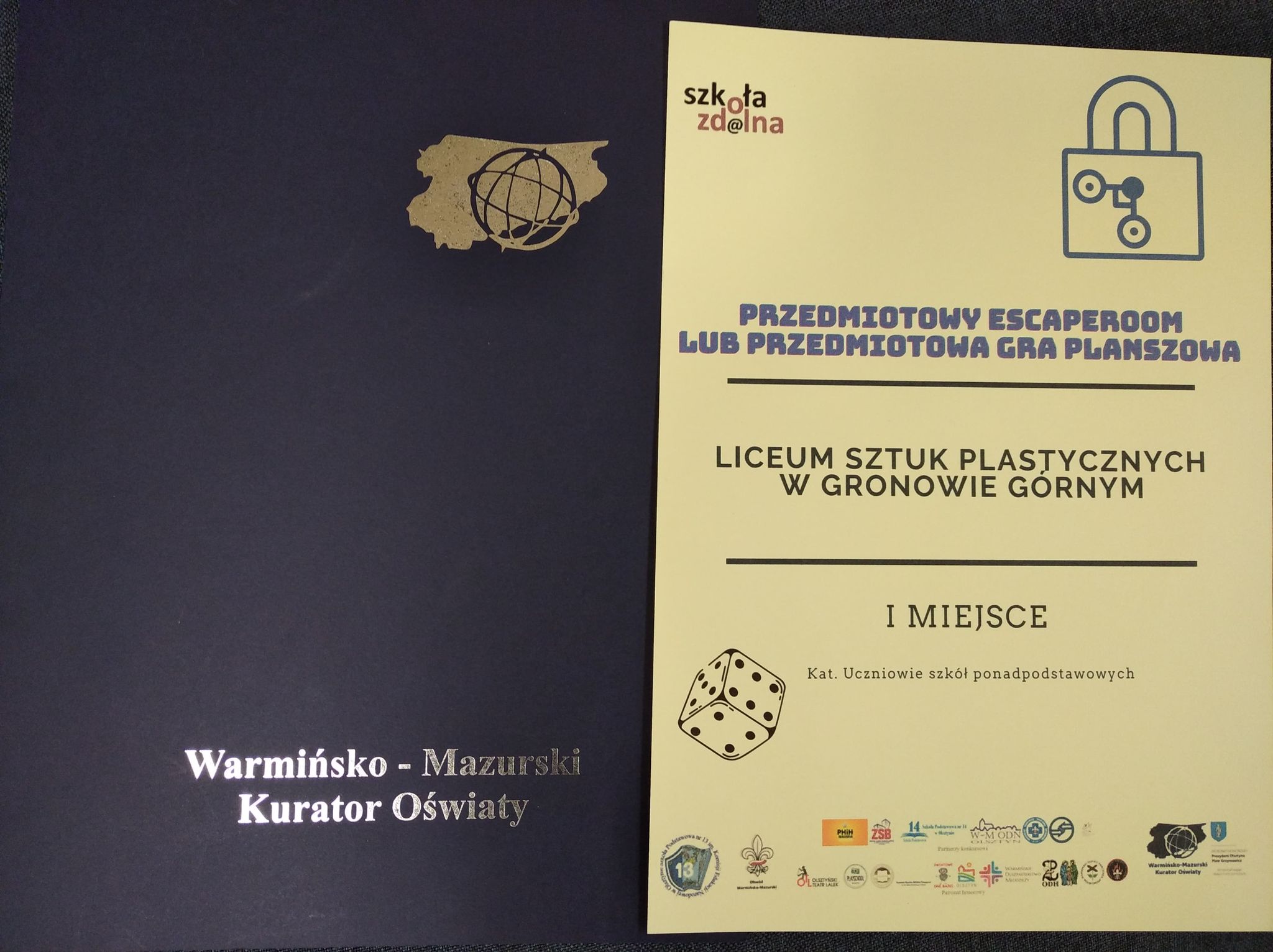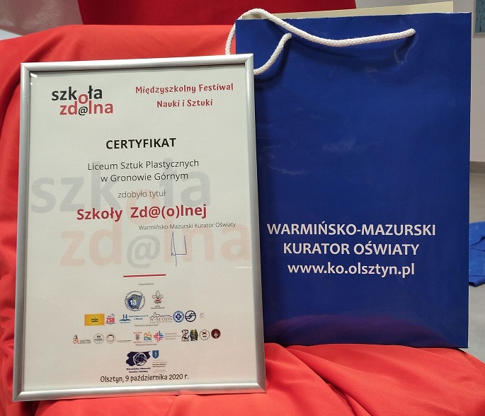 Nauczyciele Liceum Sztuk Plastycznych stanęli na wysokości zadania i podczas zdalnego nauczania organizowali ciekawe lekcje, angażujące uczniów w różnorodne aktywności. Zwieńczeniem tych internetowych działań było wzięcie udziału w Międzyszkolnym Festiwalu Nauki i Sztuki organizowanym przez Kuratorium Oświaty w Olsztynie, za co nasza szkoła otrzymała 9 października certyfikat Szkoły Zd@(o)lnej. Ponadto Warmińsko – Mazurski Kurator Oświaty przyznał szkole pierwsze miejsce w kategorii dydaktyczna gra planszowa i wyróżnił uczniów, którzy stworzyli przedmiotowy escaperoom, dotyczący mitologii słowiańskiej i germańskiej.