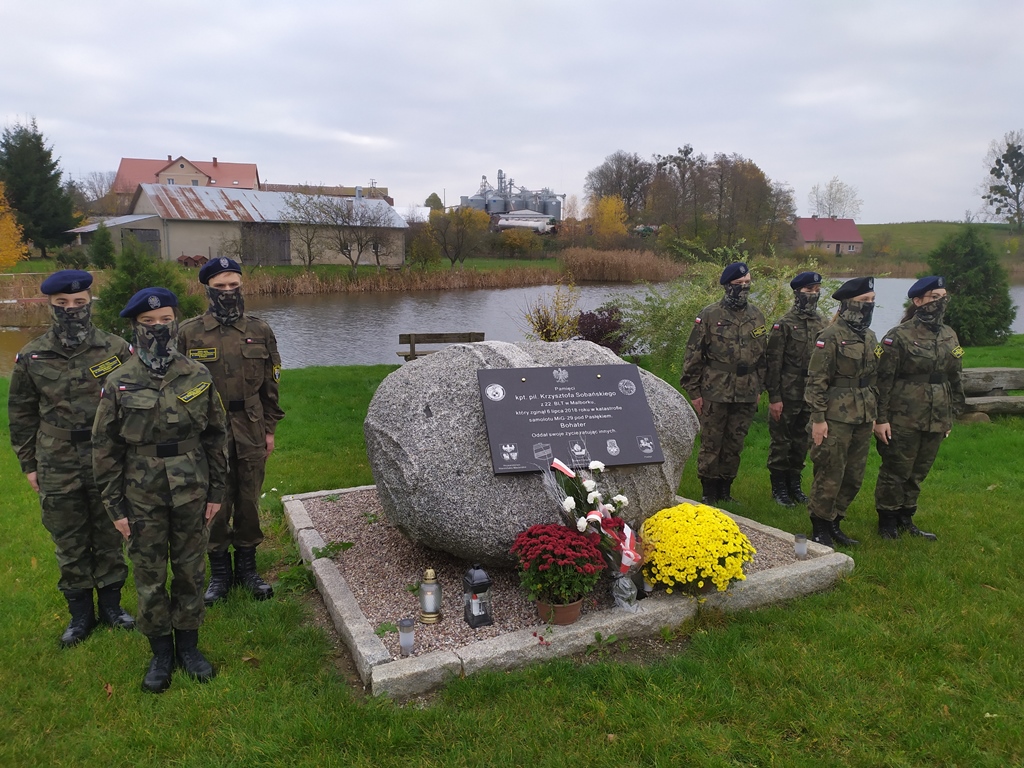 Pamiętamy także o kapitanie pilocie Krzysztofie SABAŃSKIM składając wiązankę kwiatów i zapalając znicze pod obeliskiem poświeconym jego pamięci w Krasinie. Także kadeci zaciągnęli posterunek honorowy.