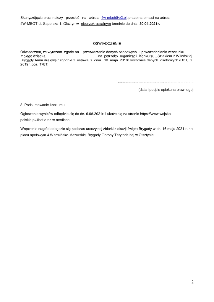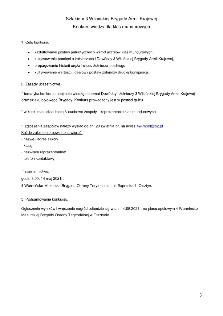Zaprojektuj pomnik /obelisk upamiętniający działalność 3 Wileńskiej Brygady Armii Krajowej wyślij w postaci skanu lub zdjęcia na adres 4w-mbot@o2.pl do dn. 30.04.2021r. Oryginał pracy należy wysłać na adres 4 Warmińsko-Mazurskiej Brygady Obrony Terytorialnej , ul. Saperska 1, 10-073 Olsztyn do 30.04.2021r. Najlepsze prace zostaną opublikowane na naszej stronie - powstanie z nich wyjątkowy album.