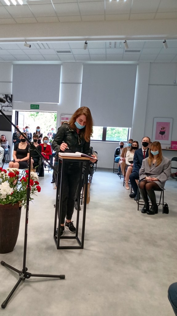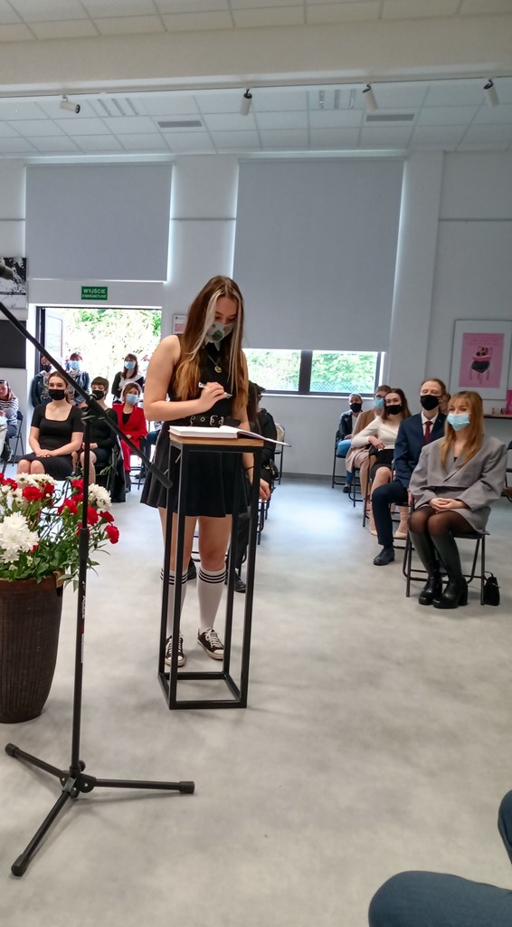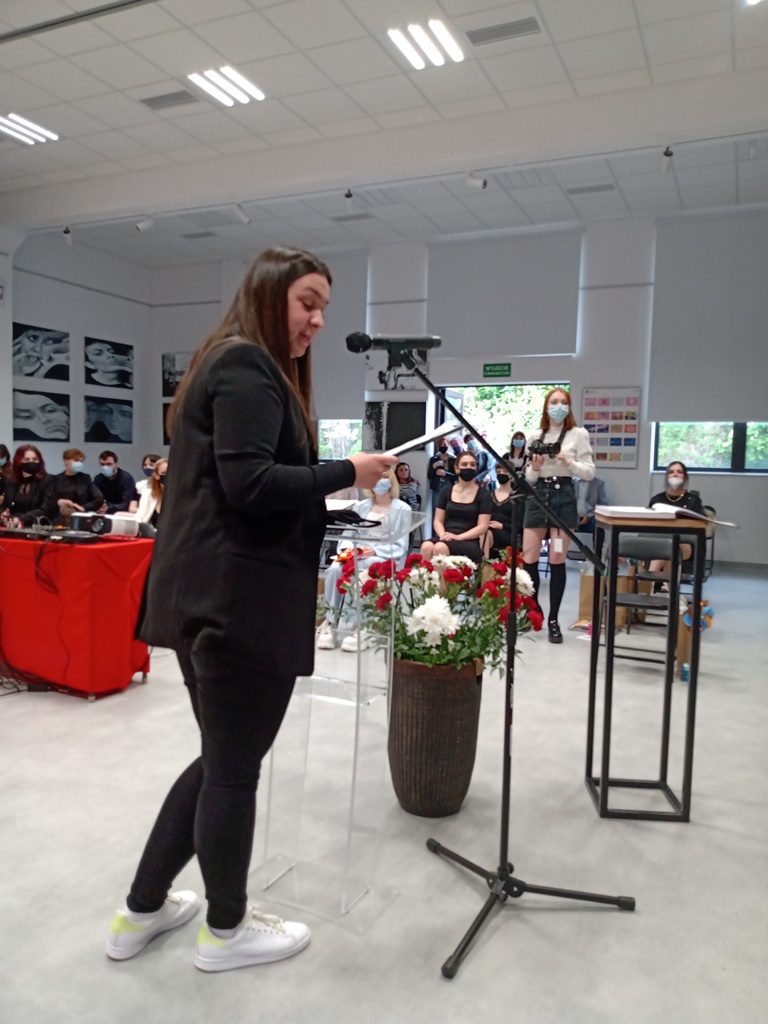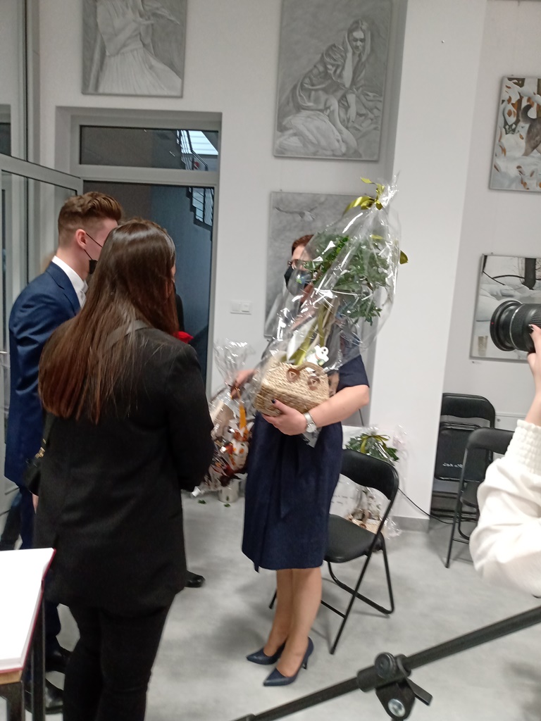 Pani Krystyna Brinkiewicz – dyrektor szkoły pogratulowała uczniom sukcesów i osiągnięć. Życzyła absolwentom dobrych wyborów, szczególnie dotyczących dalszego kształcenia. Na ręce Pana Wicestarosty złożyła podziękowania za troskę organu prowadzącego szkołę w zapewnieniu bezpiecznych warunków do nauki, w szczególności przedmiotów artystycznych.