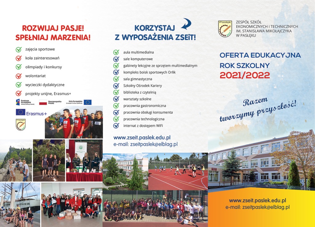 Zapraszamy do zapoznania się z ofertą edukacyjną Zespołu Szkół Ekonomicznych i Technicznych im. Stanisława Mikołajczyka w Pasłęku na rok szkolny 2021/2022.