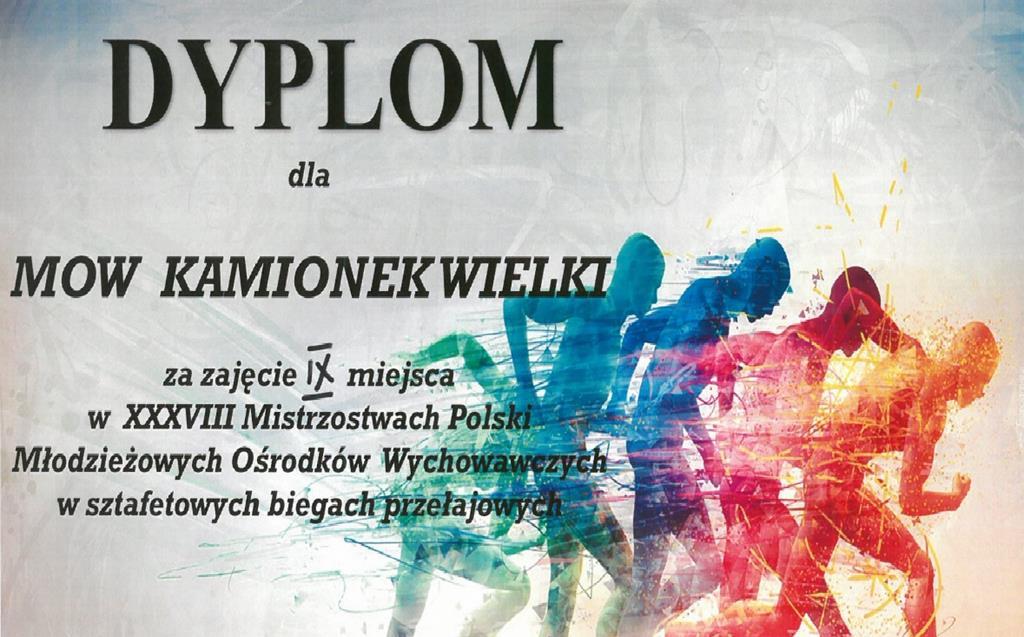 W dniu 16.06.2021r. we Włocławku odbyły się 38 Finał Mistrzostw Polski Młodzieżowych Ośrodków Wychowawczych w sztafetowych biegach przełajowych. Reprezentujący naszą placówkę uczniowie zajęli 9 miejsce na 14 startujących drużyn. O skali trudności biegu może świadczyć fakt, że drużyna gospodarzy broniąca tytułu mistrza, poprzez błąd techniczny przy przekazywaniu pałeczki sztafetowej, spadła w klasyfikacji na ostatnie miejsce. Nasi uczniowie zaprezentowali się od najlepszej strony, walcząc ze wszystkich sił na każdym etapie rywalizacji sportowej, zarówno podczas całego pobytu jak i wyjazdu. W skład drużyny MOW Kamionek Wielki wchodzili: B.Szkutnik, S.Tusk, D.Górski, D.Dybowski, J.Pomorski, K.Witkiewicz. Opiekunem był p. L.Grędziński