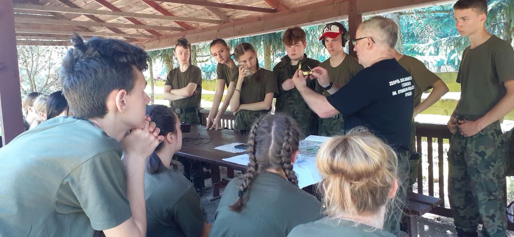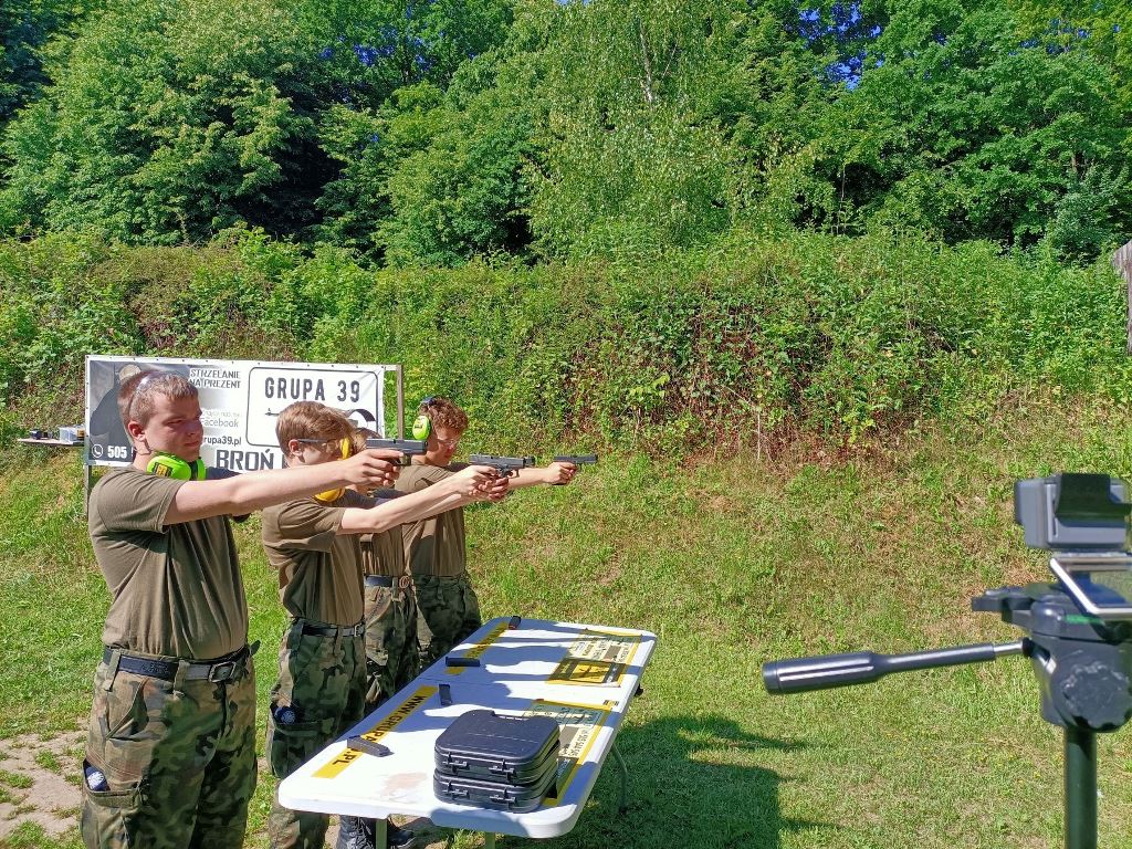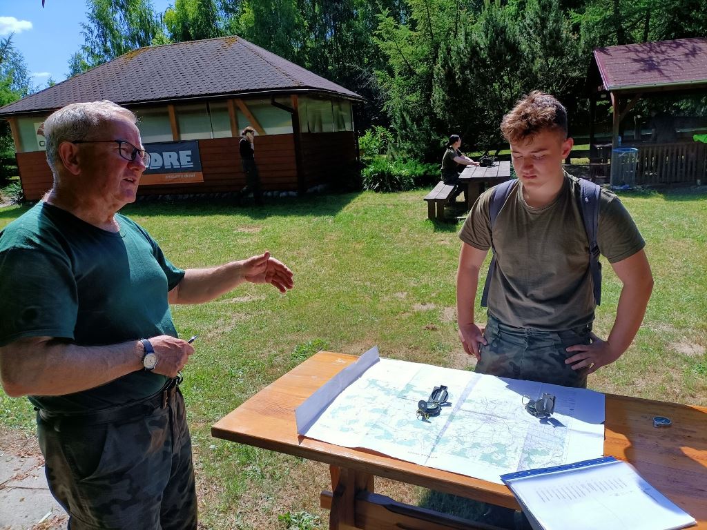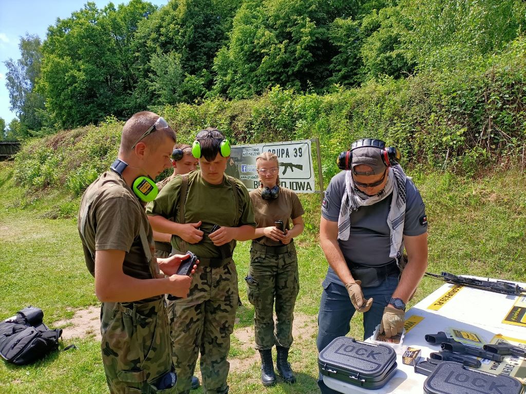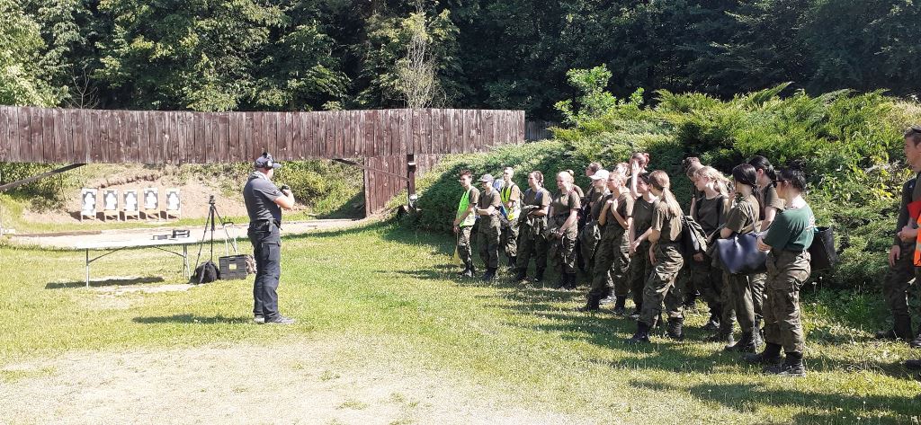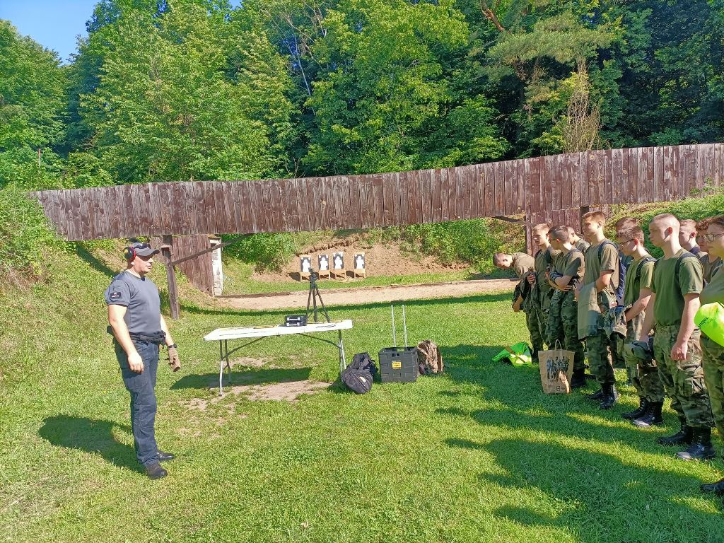 Po przemieszczeniu się, czyli przemaszerowaniu około 8 km przy upalnej pogodzie kadeci przystąpili do realizacji zajęć. Instruktor strzelectwa z GRUPY 39kom. policji Krzysztof Nowacki zapoznał wszystkich z warunkami BHP, strzelania z pistoletu typu GLOCK-kaliber 9 mm oraz z karabinków: tradycyjnego kbkAK /KAŁASZNIKOWA/ - 7,62 mm, BERYLA -5,45 mm. Zgodnie z planem kadeci podzielili się na czteroosobowe grupy. Jedna realizowała strzelanie, a pozostałe szkoliły się na punktach nauczania: nawiązywania łączności po kablu przez telefon TAP, czyli telefoniczny aparat polowy i wskazywania kierunków stron świata oraz orientowania mapy topograficznej za pomocą kompasu lub busoli.