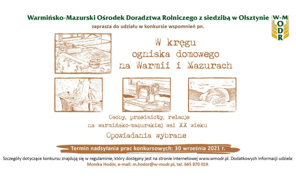 Warmińsko-Mazurski Ośrodek Doradztwa Rolniczego z siedzibą w Olsztynie ogłosił konkurs wspomnień pn. „W kręgu ogniska domowego na Warmii i Mazurach. Osoby, przedmioty, relacje na warmińsko-mazurskiej wsi XX wieku. Opowiadania wybrane”. Celem konkursu jest zachowanie i popularyzacja dziedzictwa kulturowego i przyrodniczego wsi.