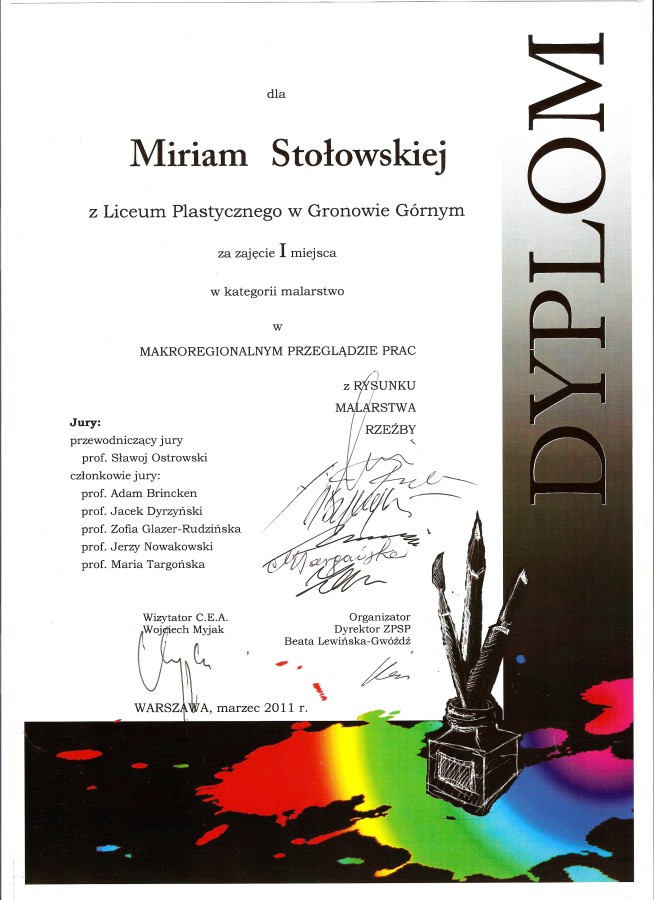 Przegląd jest obowiązkowy dla III klas liceum plastycznego, odbywa się w czterech makroregionach. Liceum w Gronowie Górnym po raz pierwszy wzięło w nim udział. Dużym sukcesem jest I miejsce w kategorii malarstwo dla Miriam Stołowskiej. Uczniowie zaprezentowali swoje umiejętności i warsztat twórczy. Mogli także obejrzeć wystawę w Galerii Zachęta i spotkali się z rzeźbiarzem Andrzejem Renesem. Nauczycielom pozostało trzymać kciuki i zwiedzić Muzeum Powstania Warszawskiego.