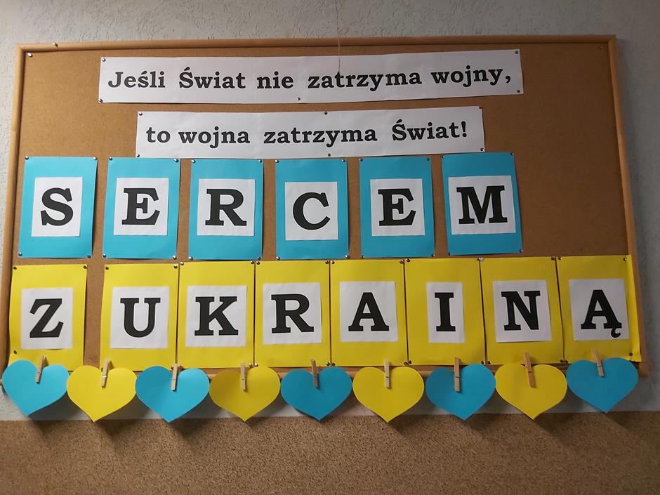 W dniu 9 marca 2022 r. Samorząd Szkolny zorganizował akcję „Sercem z Ukrainą”. Przygotowaliśmy teksty przypominające historię agresji Rosji na Ukrainę oraz serduszka w barwach narodowych Ukrainy, które nasi uczniowie nosili na znak solidarności z tym krajem.