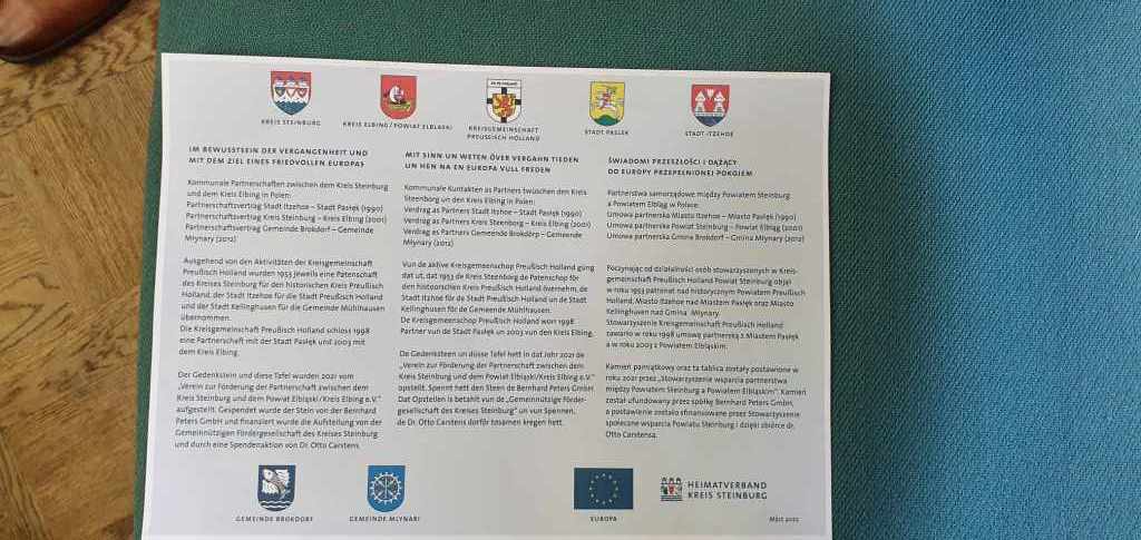 8 kwietnia 2022 roku z okazji XX-lecia współpracy dwóch Powiatów: Steinburg i Elbląskiego odbyło się uroczyste odsłonięcie pamiątkowego kamienia w Itzehoe w Niemczech. Delegację Powiatu Elbląskiego reprezentowali: Starosta Elbląski Pan Maciej Romanowski oraz Radny Powiatu Elbląskiego Pan Dariusz Ponichtera wraz z tłumaczem.
