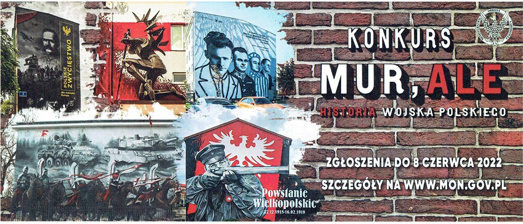 Zachęcamy do tworzenia murali opowiadających o Wojsku Polskim i walkach o suwerenność Polski, od średniowiecza po współczesność. Prace mogą także upamiętniać ważne dla regionu wydarzenia historyczne lub przypominać o lokalnych bohaterach walk o niepodległość. Mural, nie mniejszy niż 3 metry szerokości i 3 metry wysokości, powinien zostać wykonany techniką zapewniającą 5-letnią trwałość.