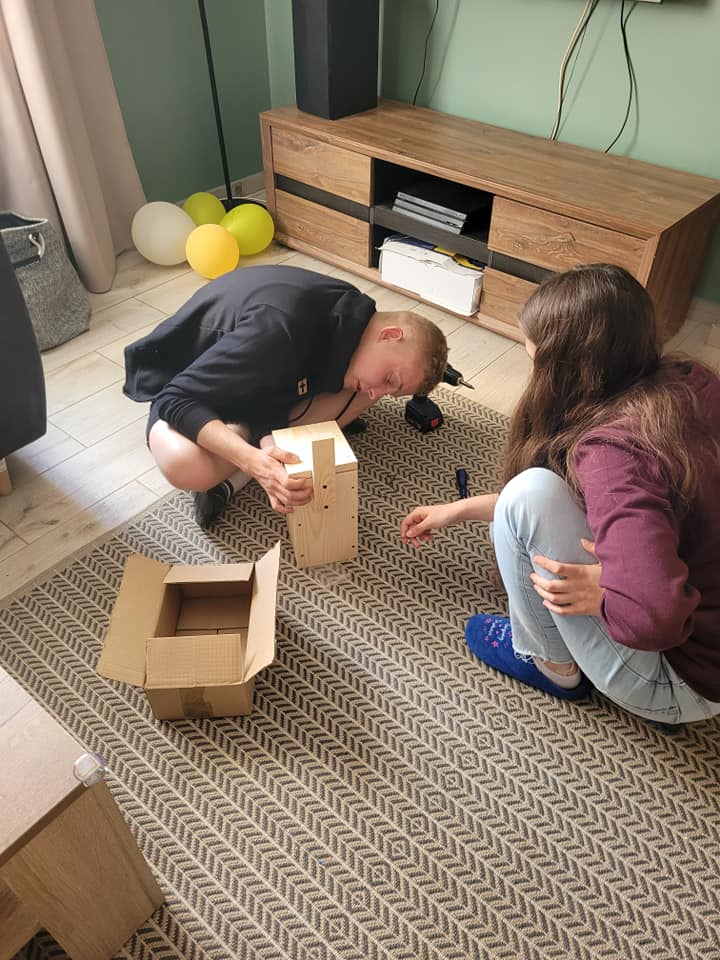 Podzieleni na dwu osobowe zespoły wychowankowie rywalizowali w konkursie na najszybsze złożenie budki lęgowej. Tu bezkonkurencyjne były Julia i Gosia.