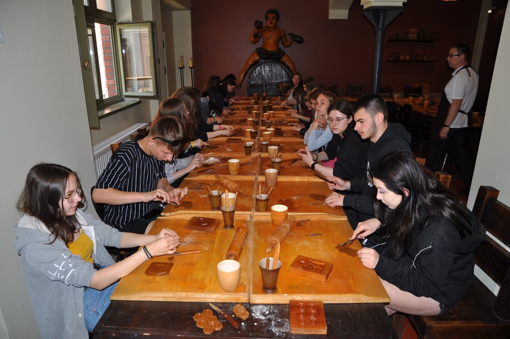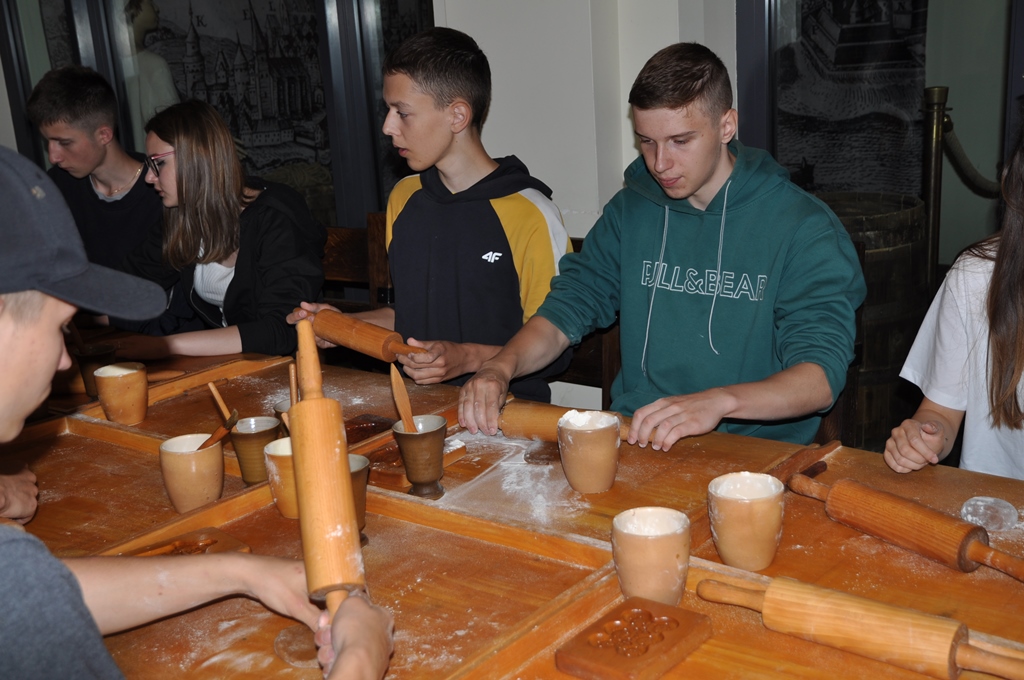 Pierwszą atrakcją była wizyta w Żywym Muzeum Piernika. Uczniowie mieli okazję posłuchać barwnej opowieści o tym, jak to dawniej wypiekano pierniki. Przy pomocy oryginalnych form upiekli własne pierniki, które zabrali jako pamiątkę do domu.