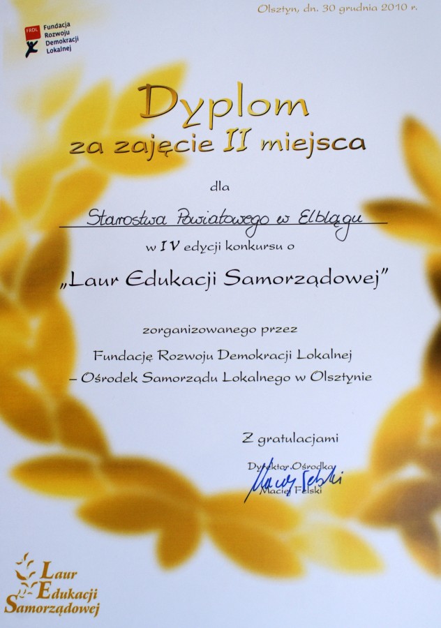 30 czerwca podczas VII sesji Rady Powiatu starosta Sławomir Jezierski otrzymał z rąk dyrektora Ośrodka Samorządu Lokalnego w Olsztynie Fundacji Rozwoju Demokracji Lokalnej Macieja Felskiego statuetkę i dyplom za zajęcie przez Starostwo Powiatowe w Elblągu II miejsca w IV edycji konkursu o „Laur Edukacji Samorządowej”.