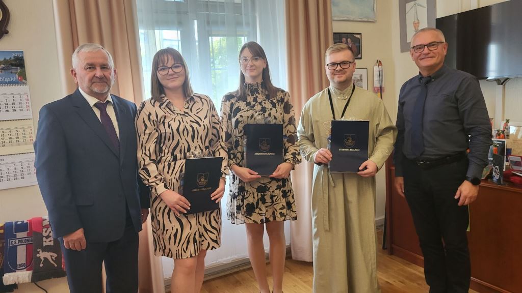 W dniu dzisiejszym Starosta Elbląski Maciej Romanowski oraz Wicestarosta Ryszard Zając wręczyli nominacje nowym nauczycielom mianowanym, co było zwieńczeniem pomyślnie zdanego egzaminu, na którym pedagodzy zostali pozytywnie ocenieni przez komisję egzaminacyjną. Składając swoje ślubowanie p. Żaneta Polkowska (LSP), p. Ewa Owczarek (LSP) i ks. Igor Hubacz (ZS) przyrzekali rzetelnie pełnić powinność wychowawcy i opiekuna młodzieży.