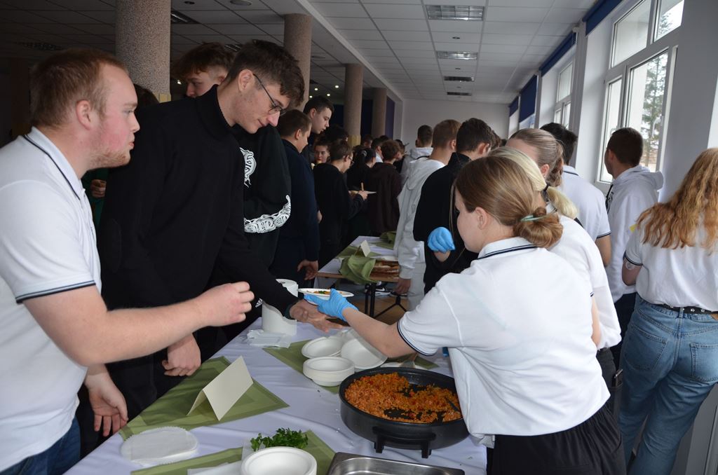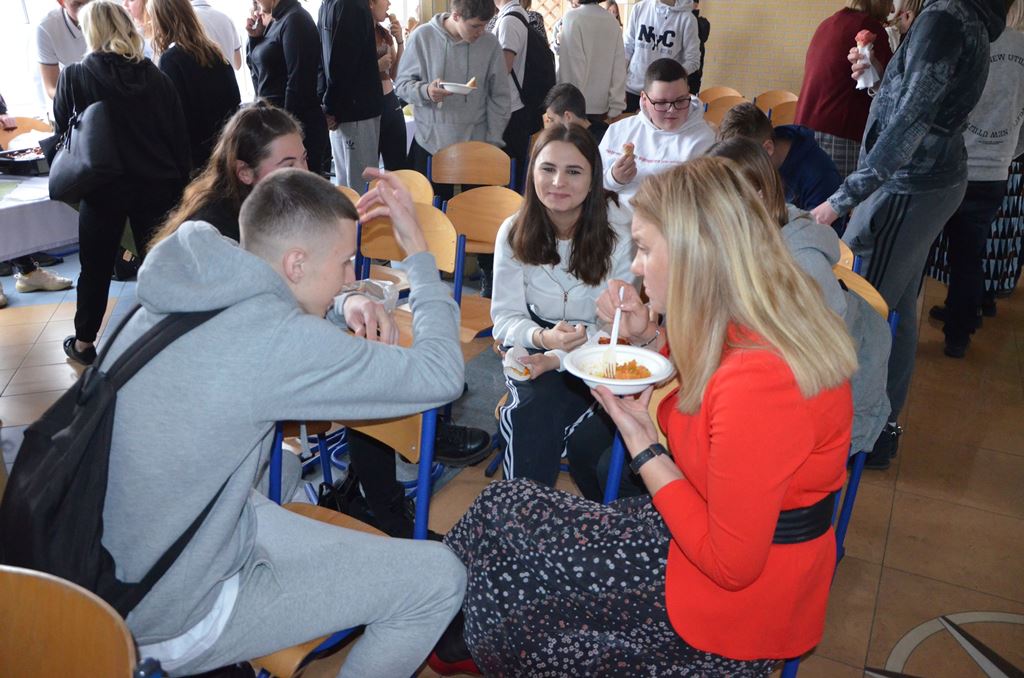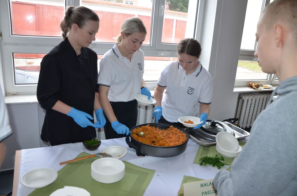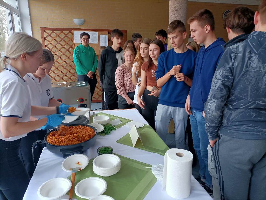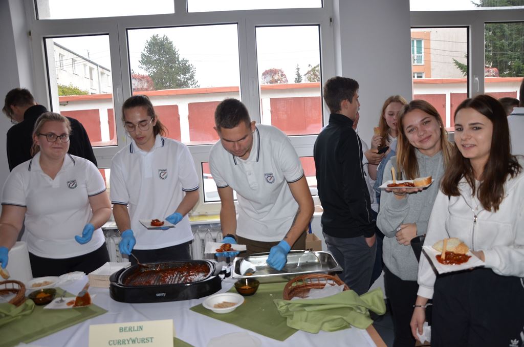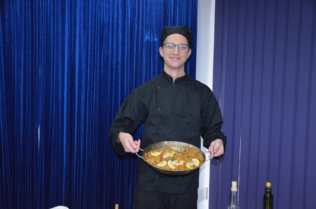 Z tej okazji 29 uczestników projektu zaprezentowało szkolnej społeczności korzyści płynące z ich udziału w zagranicznych mobilnościach w postaci filmików, osobistych i emocjonujących relacji z pobytu oraz przygotowanego poczęstunku, który składał się z typowych dań kuchni włoskiej, niemieckiej i hiszpańskiej. Młodzież przygotowała Currywurst oraz paellę, odtwarzając smaki, które miała okazję poznać podczas swoich dwutygodniowych praktyk. Uczniowie serwowali również przepyszne włoskie lody. Jedną z atrakcji było gotowanie na żywo. Michał, uczestnik stażu z Hiszpanii, gotując potrawę na scenie, zaprezentował obecnym gościom sposób przygotowania paelli z owocami morza.
