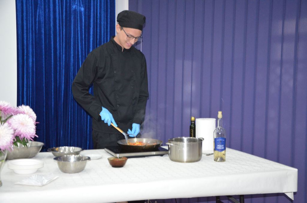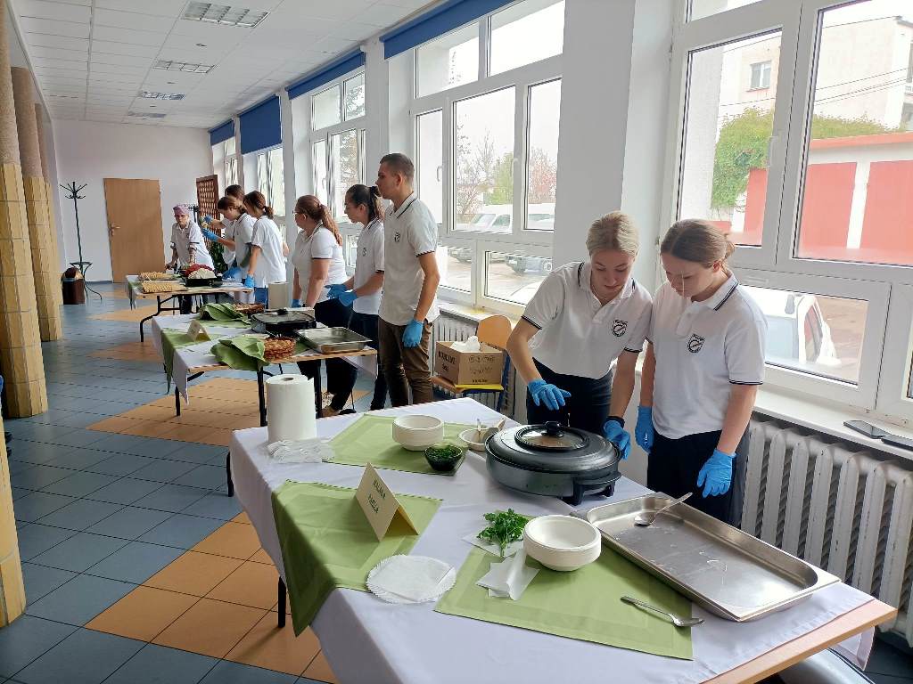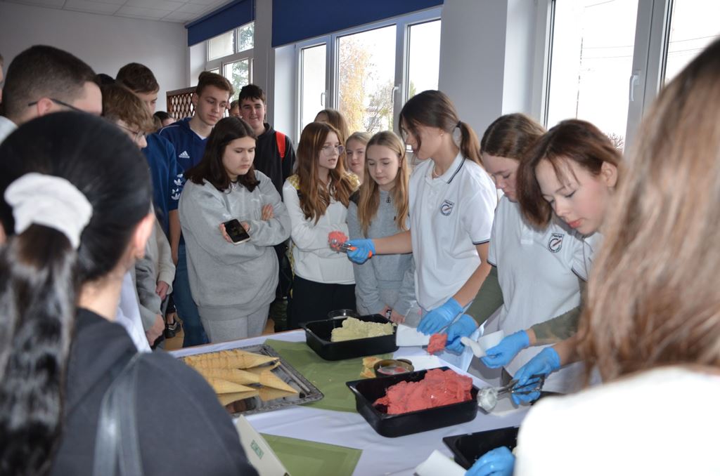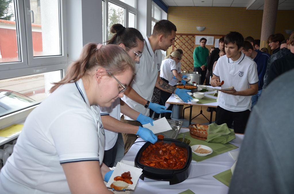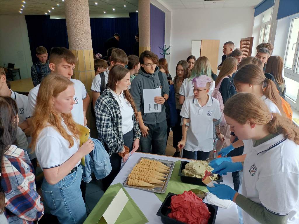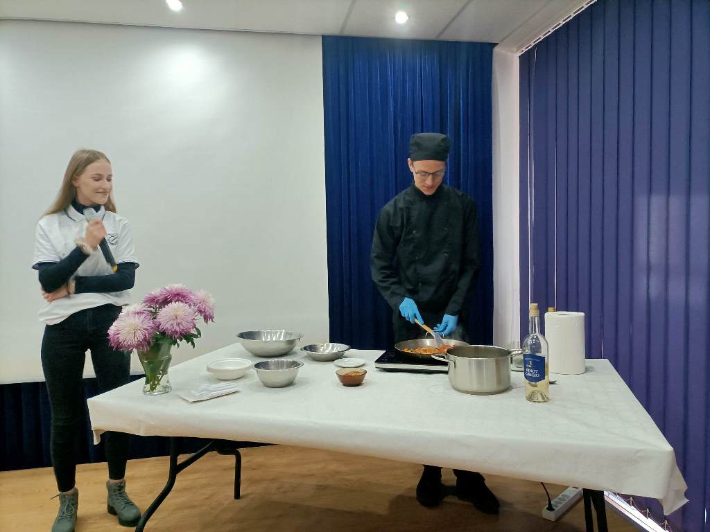 Z tej okazji 29 uczestników projektu zaprezentowało szkolnej społeczności korzyści płynące z ich udziału w zagranicznych mobilnościach w postaci filmików, osobistych i emocjonujących relacji z pobytu oraz przygotowanego poczęstunku, który składał się z typowych dań kuchni włoskiej, niemieckiej i hiszpańskiej. Młodzież przygotowała Currywurst oraz paellę, odtwarzając smaki, które miała okazję poznać podczas swoich dwutygodniowych praktyk. Uczniowie serwowali również przepyszne włoskie lody. Jedną z atrakcji było gotowanie na żywo. Michał, uczestnik stażu z Hiszpanii, gotując potrawę na scenie, zaprezentował obecnym gościom sposób przygotowania paelli z owocami morza.
