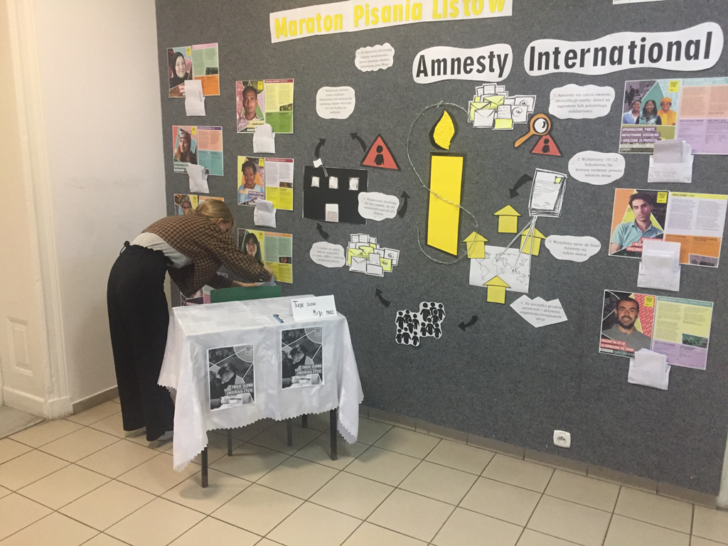 W tym roku motywem przewodnim Maratonu jest prawo do pokojowych zgromadzeń. Demonstracje to niezwykle istotne narzędzie zmiany społecznej, tymczasem na całym świecie władze brutalnie tłumią i bezprawnie zakazują zgromadzeń. Pisząc listy okazujemy wsparcie tym, których spotyka więzienie i prześladowania tylko dlatego, że odważyli się głośno sprzeciwić niesprawiedliwości! Nasza szkoła od 28 listopada do 5 grudnia dawała możliwość napisania listów. Uczniowie bardzo chętnie zaangażowali się w przedsięwzięcie.