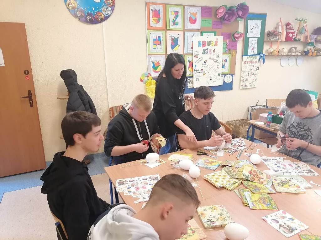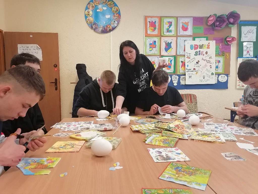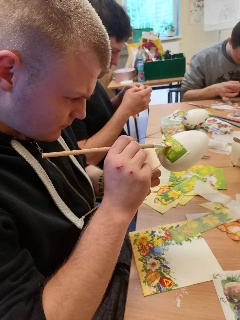 To jest czas kiedy wszyscy przygotowują się do ,,Świąt Wielkanocnych”. Również wychowankowie grupy VI uczestniczyli w integracyjnych warsztatach rękodzieła. Założeniami warsztatów jest odpoczynek, twórcza zabawa, poznanie nowych technik artystycznych i integracja wspólnoty ośrodkowej. Chłopcy wykonali jaja techniką decupage czyli zastosowanie ozdobnej serwetki w formie dekoracji jaja. Przy okazji świetnie się przy tym bawili. Pomagali i podpowiadali wzajemnie pomysły. Zajęcia plastyczne odgrywają ważna rolę w rozwijaniu kreatywności, samodzielności a nasi podopieczni świetnie sobie poradzili i wykonali piękne dekoracje wielkanocne.