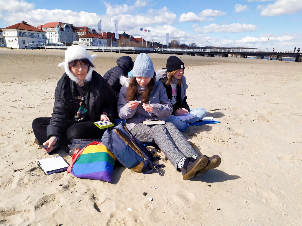 Warto wspomnieć, że w czasie, gdy klasy II i IV oglądały ekspozycję w Sopockim Domu Aukcyjnym – obie klasy I mierzyły się z procesem twórczym. Na niewielkich formatach papieru do akwareli młodzież próbowała uchwycić wrażenia, impresje, emocje powstałe w kontakcie z morzem, plażą, wiatrem, niebem, wodą. Czy zadanie udało się wykonać pomimo wiatru i ziarenka piasku w oku? Przekonamy się podczas wystawy!