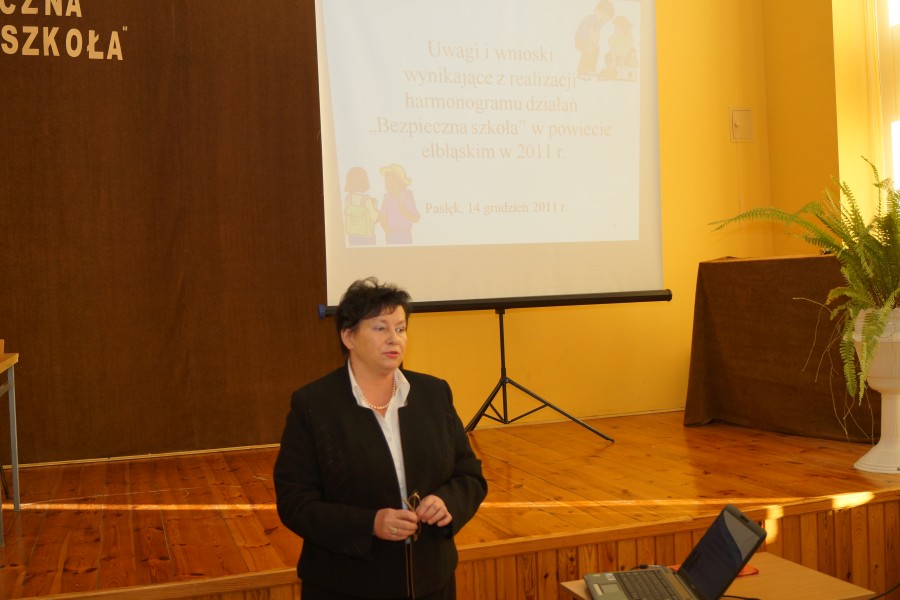 Gabriela Effenberg, naczelnik Wydziału Promocji Powiatu, Edukacji, Kultury i Sportu Starostwa Powiatowego w Elblągu, dokonała podsumowania realizacji programu „Bezpieczna szkoła” w roku 2011 w oparciu o sprawozdania złożone przez poszczególne placówki oświatowe i inne jednostki realizujące program.