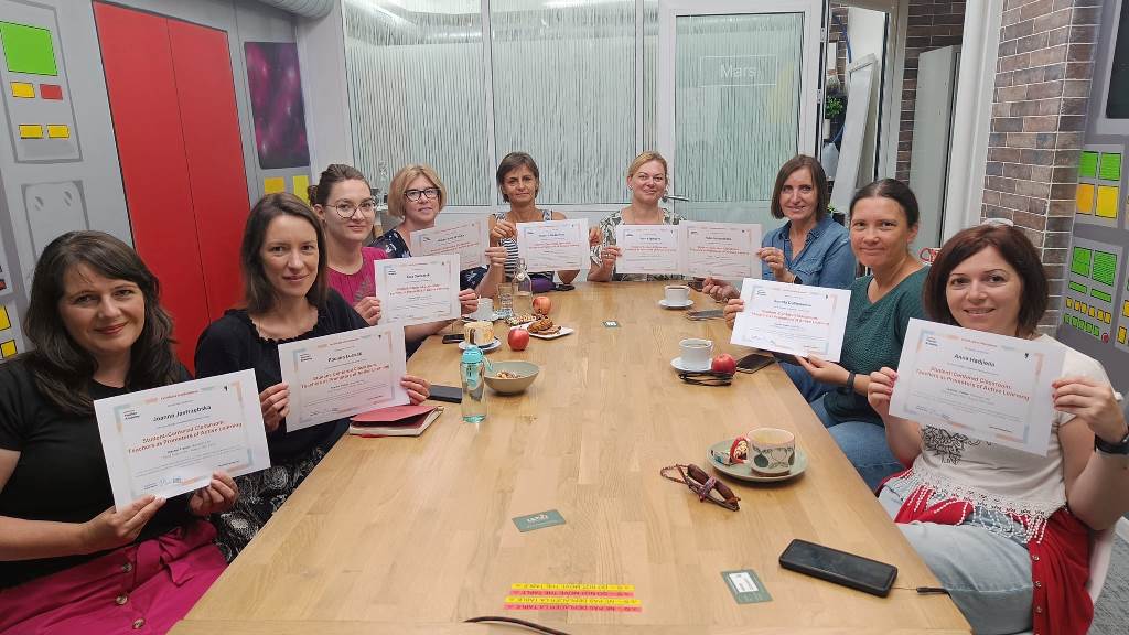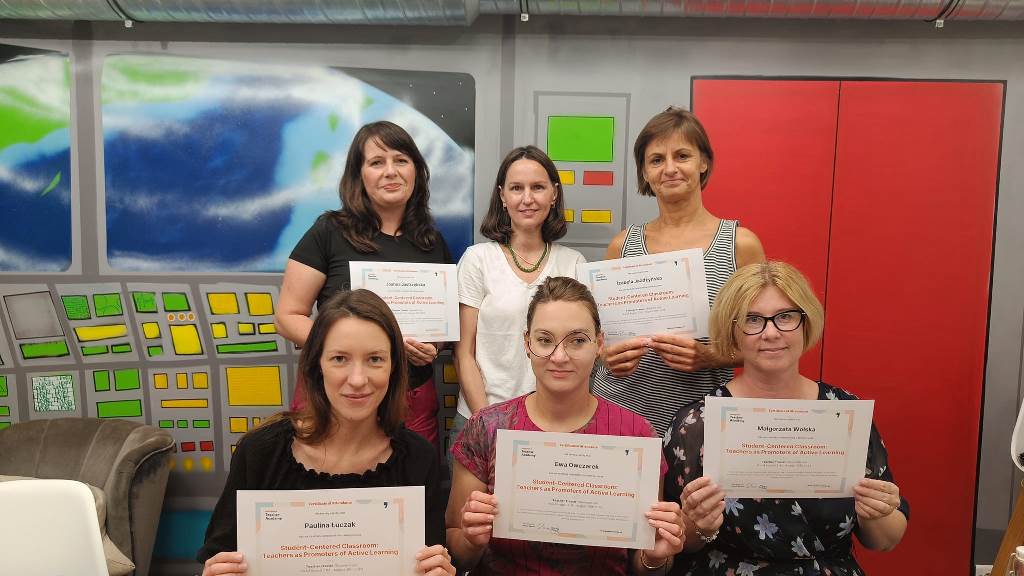 Kurs pod tytułem: Student- Centerd Classroom: Teachers as promoters of active learning miał na celu pomóc nauczycielom wspierać uczniów w radzeniu sobie z wyzwaniami związanymi z procesem uczenia się. Przedstawiał rozwiązania, strategie i metody zaangażowania ucznia w ich rozwój edukacyjny, wprowadzał elementy grywalizacji, podawania informacji zwrotnej, kształtowania celów oraz różnorodnego podejścia do motywacji zewnętrznej i wewnętrznej, czy opracowywania analizy potrzeb. Nauczyciele wzięli udział w grze terenowej, poznawali multimedialne aplikacje, tworzyli scenariusze lekcji, wymieniali się dobrymi praktykami oraz pracowali nad formułowaniem kryteriów oceniania.