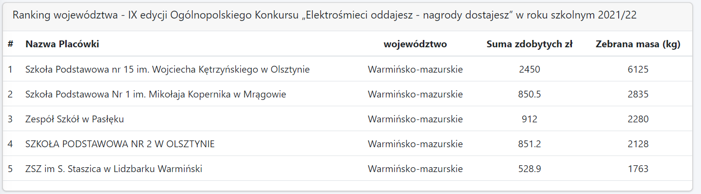 Zespół Szkół w Pasłęku otrzymał podsumowanie akcji zbierania elektrośmieci. Po przeliczeniu oddanych elektrośmieci (a było ich 2280 kg) uzyskaliśmy kwotę 912 zł i wygraliśmy dla szkoły 1000 zł w formie bonu do wykorzystania na niezbędny sprzęt elektroniczny. Ilość zebranego sprzętu uplasowała naszą szkołę w rankingu na miejscu 3 w województwie oraz 20 w kraju.