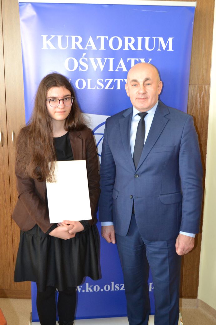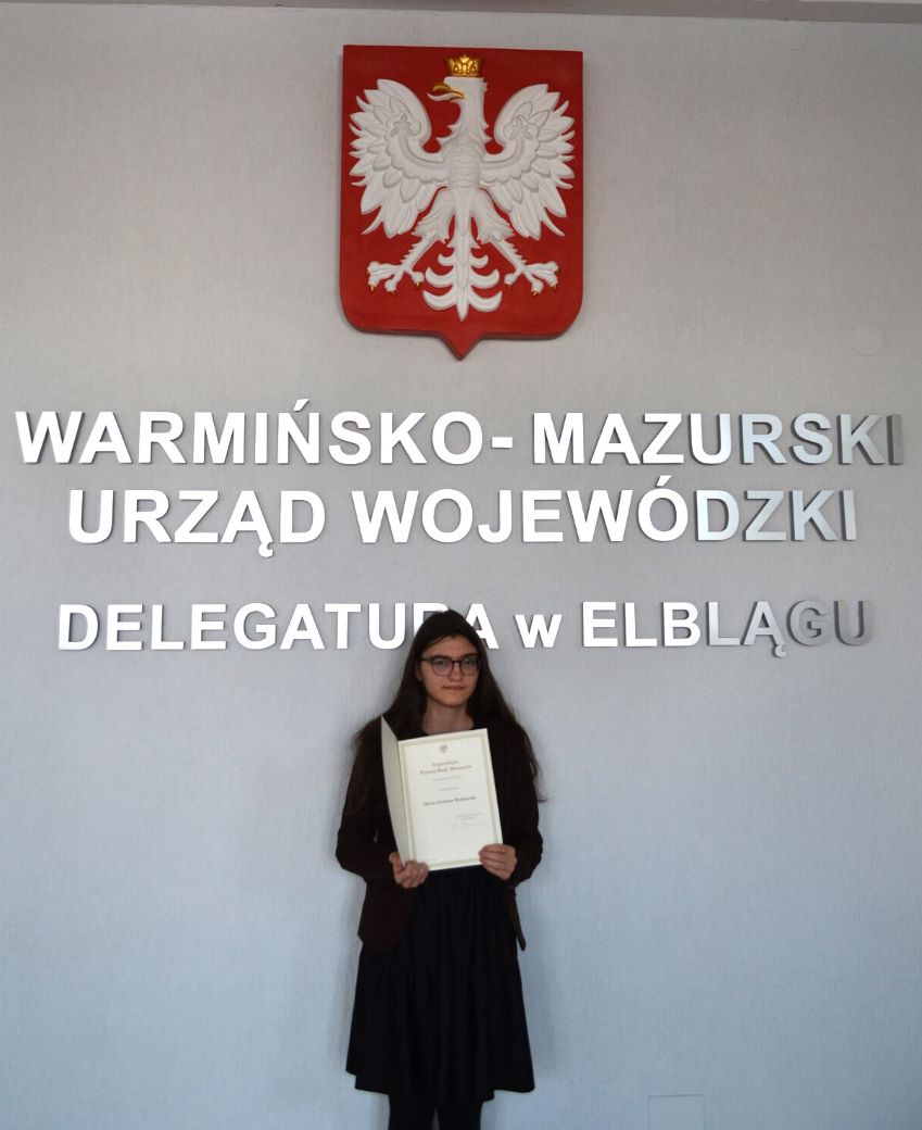 W dniu 29 listopada 2023 r., w Kuratorium Oświaty w Elblągu, uczennica Liceum Sztuk Plastycznych w Gronowie Górnym Maria Rutkowska z klasy II, otrzymała stypendium Prezesa Rady Ministrów z rąk wicekuratora oświaty, pana Wojciecha Cybulskiego.
