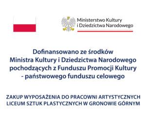 Zakup wyposażenia do pracowni artystycznych Liceum Sztuk Plastycznych w Gronowie Górnym dofinansowano ze środków Ministra Kultury i Dziedzictwa Narodowego pochodzących z Funduszu Promocji Kultury - państwowego funduszu celowego.