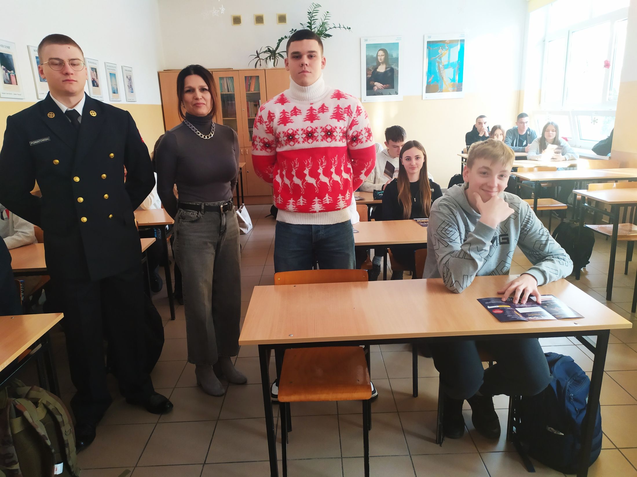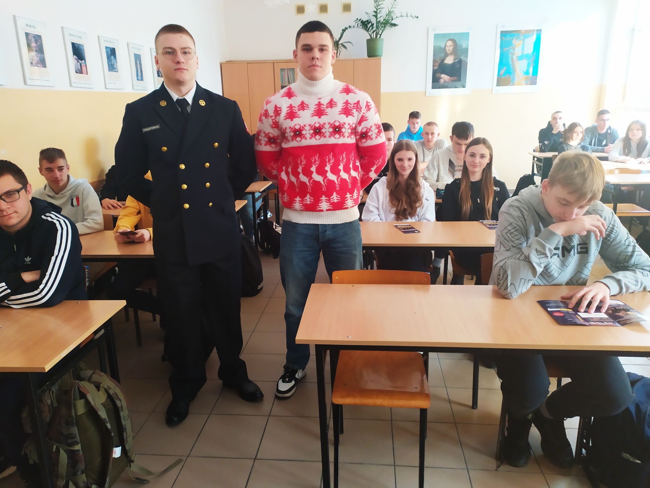 Dawid jest pierwszym absolwentem ZSEiT, który studiuje na Akademii Marynarki Wojennej, a jego wizyta miała charakter promocyjny. Studenci akademii wojskowych spotkali się z kadetami klas OPW /Oddziału Przygotowania Wojskowego/. Dzielni podchorążowie świetnie dają sobie radę na uczelniach.