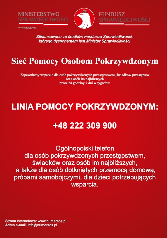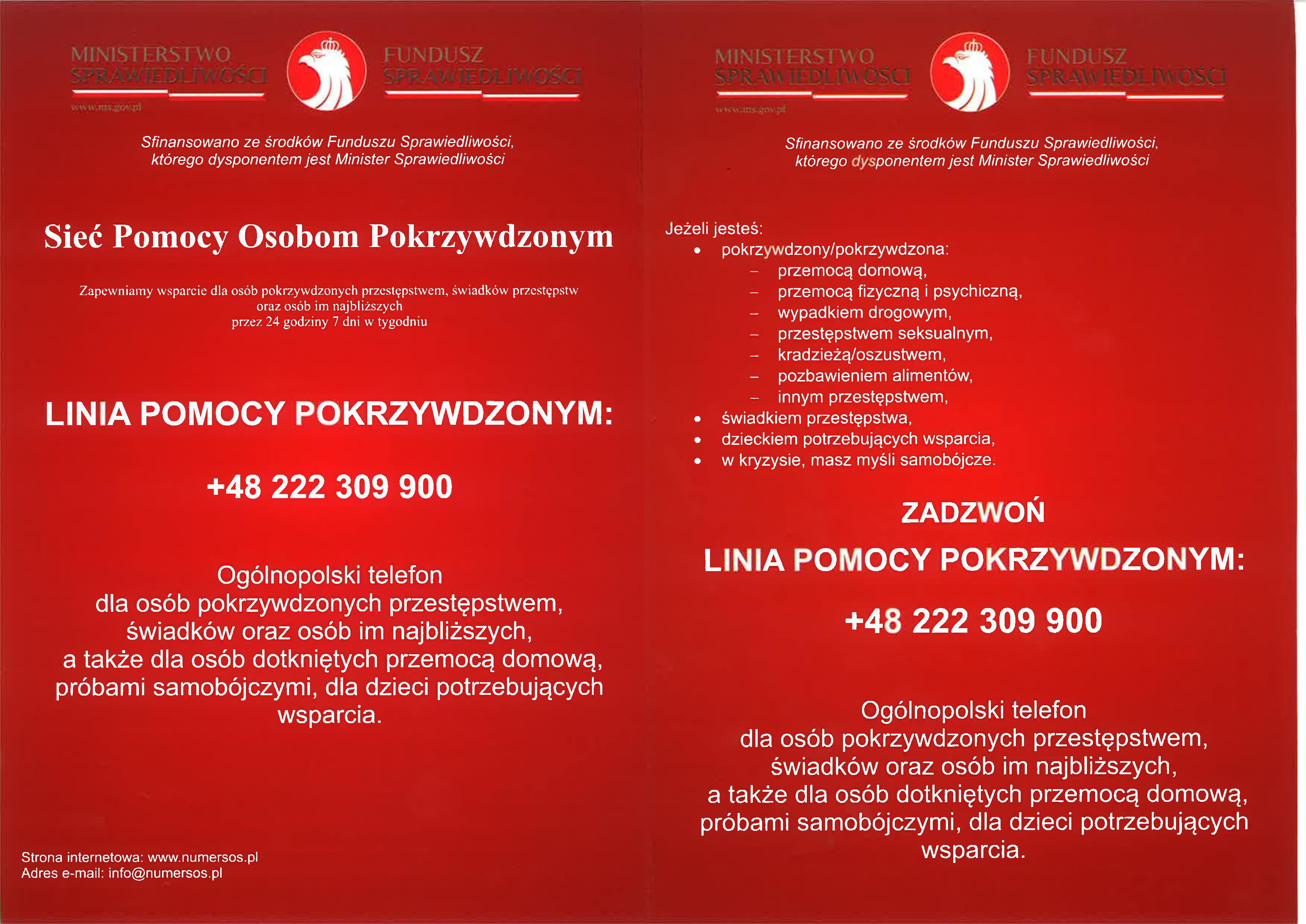 - zapewnienie osobom pokrzywdzonym przestępstwem dostępu do pomocy psychologicznej i prawnej świadczonej przez telefon i drogą elektroniczną za pośrednictwem skrzynki email info@numersos.pl,