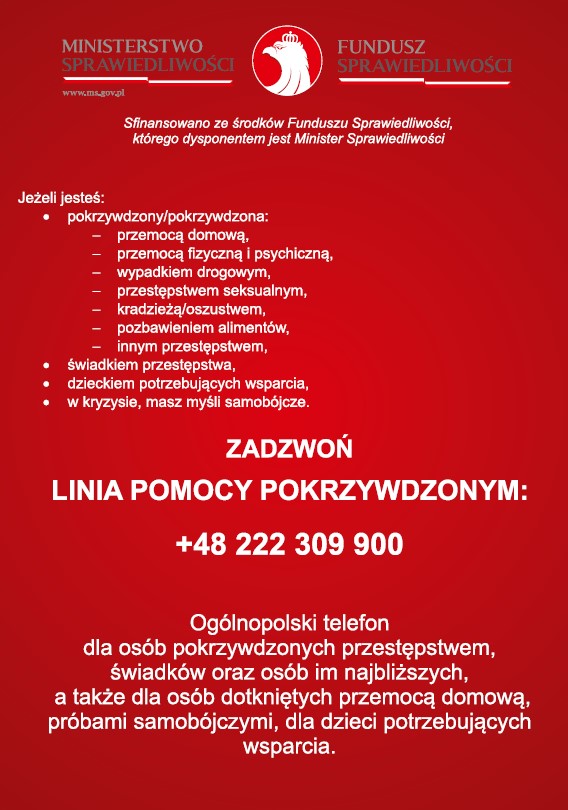 Powiatowe Centrum Pomocy Rodzinie w Elblągu informuje o funkcjonowaniu Linii Pomocy Pokrzywdzonym – ogólnopolski telefon dla osób pokrzywdzonych przestępstwem, świadków przestępstw oraz osób im najbliższych a także dla osób dotkniętych przemocą domową, próbami samobójczymi, dla dzieci potrzebujących wsparcia.