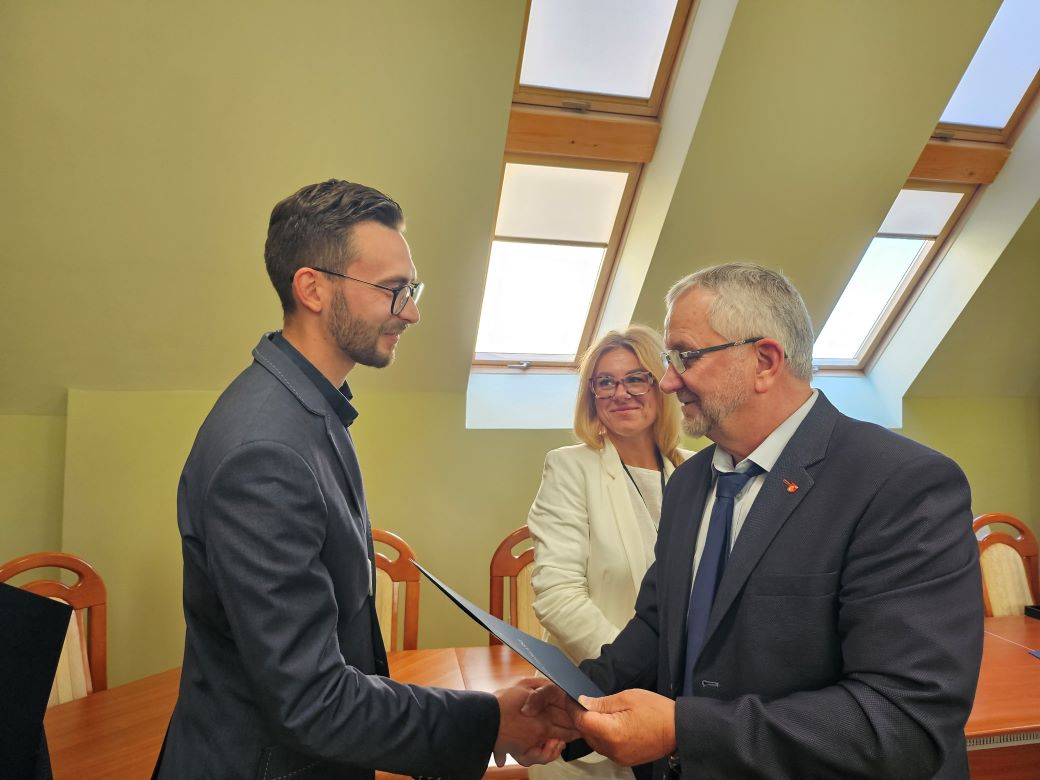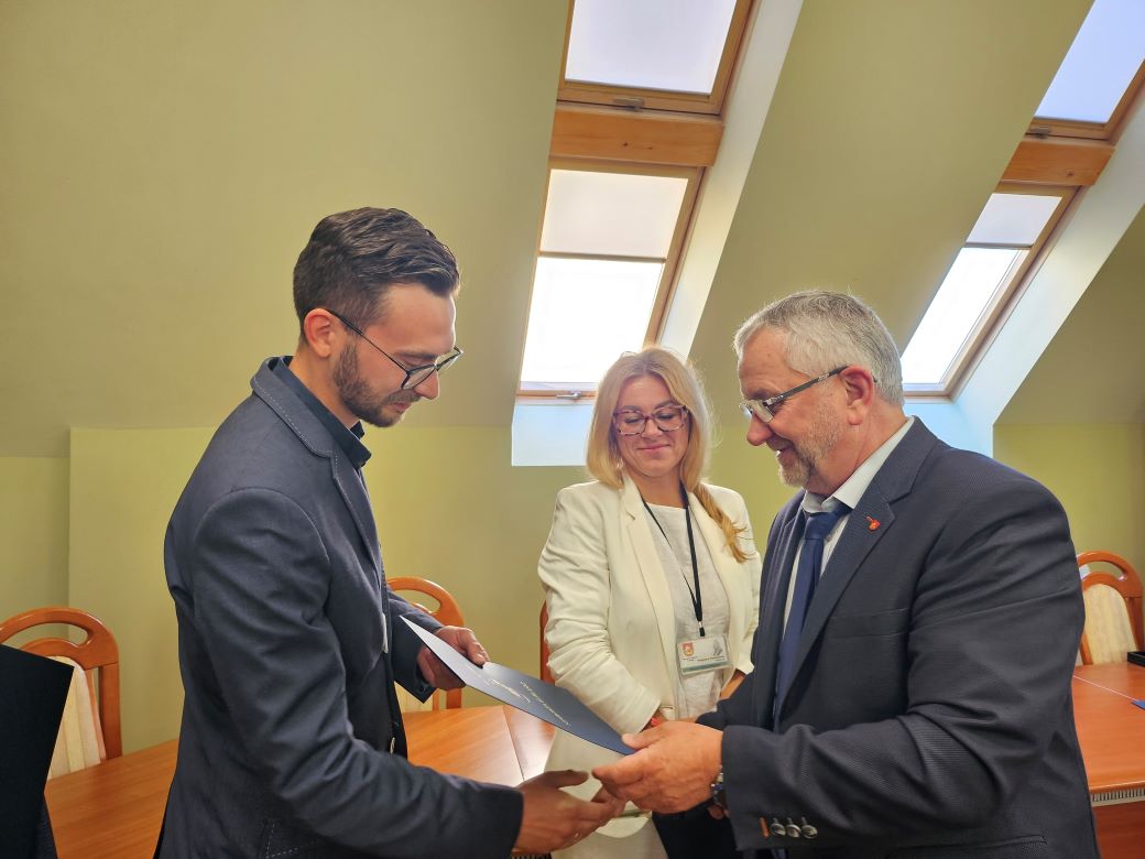 Panu Adrianowi Topolskiemu Podinspektorowi w Wydziale Architektury i Budownictwa, a także nieobecnej Pani Wioletcie Ramie Głównemu Specjaliście w Wydziale Architektury i Budownictwa oraz przekazał życzenia dalszych sukcesów w pracy zawodowej i pomyślności w życiu osobistym.