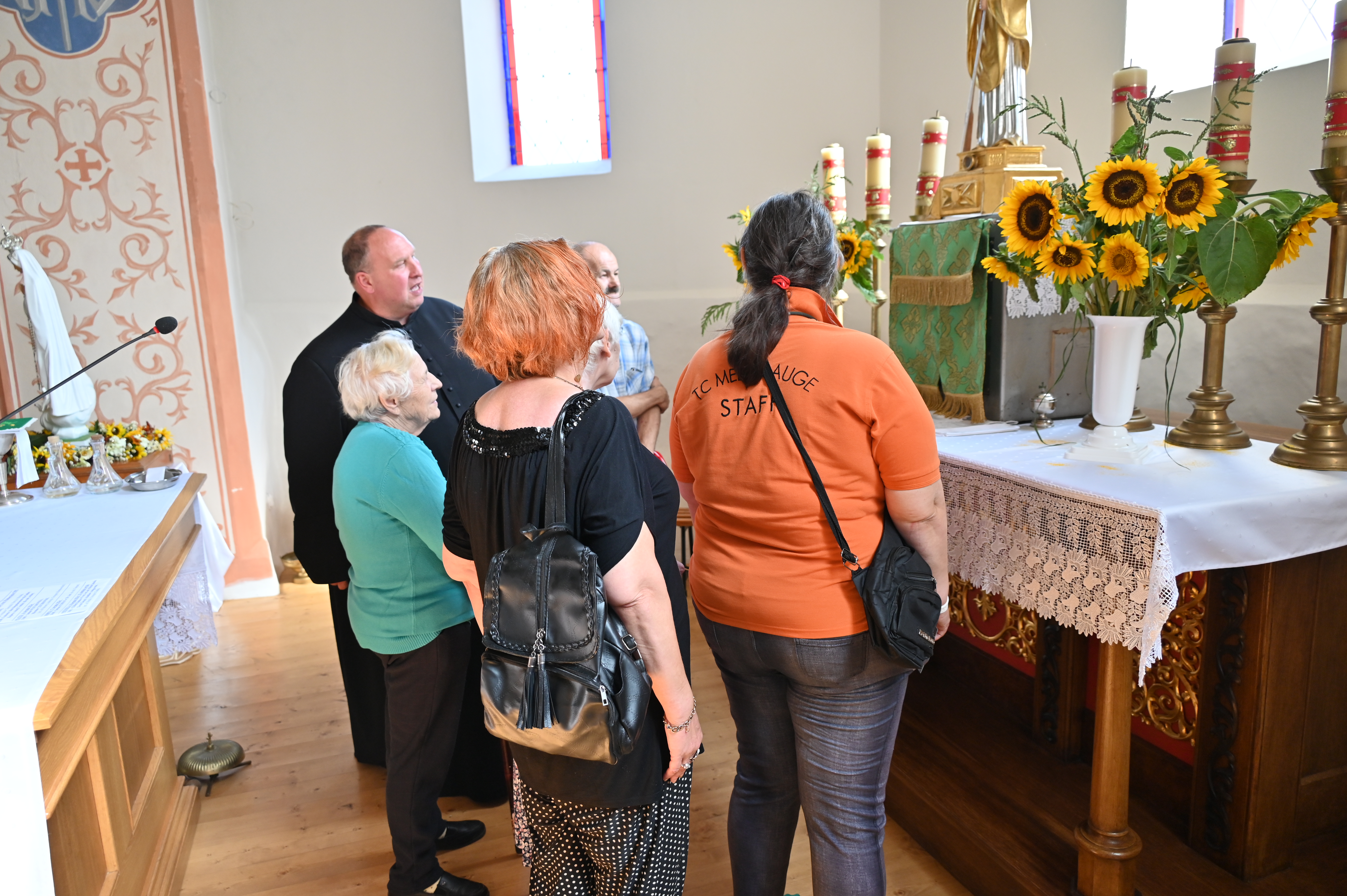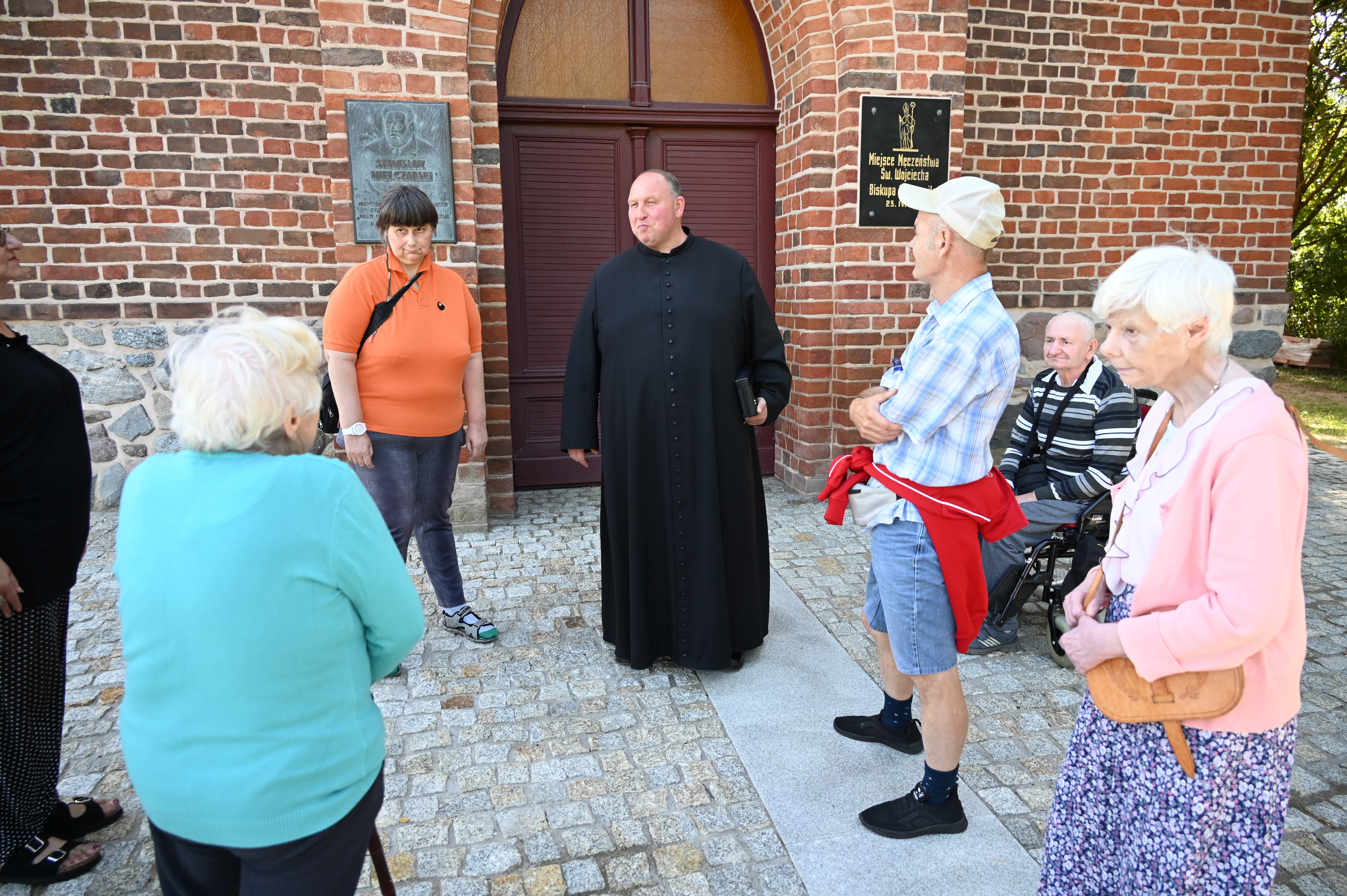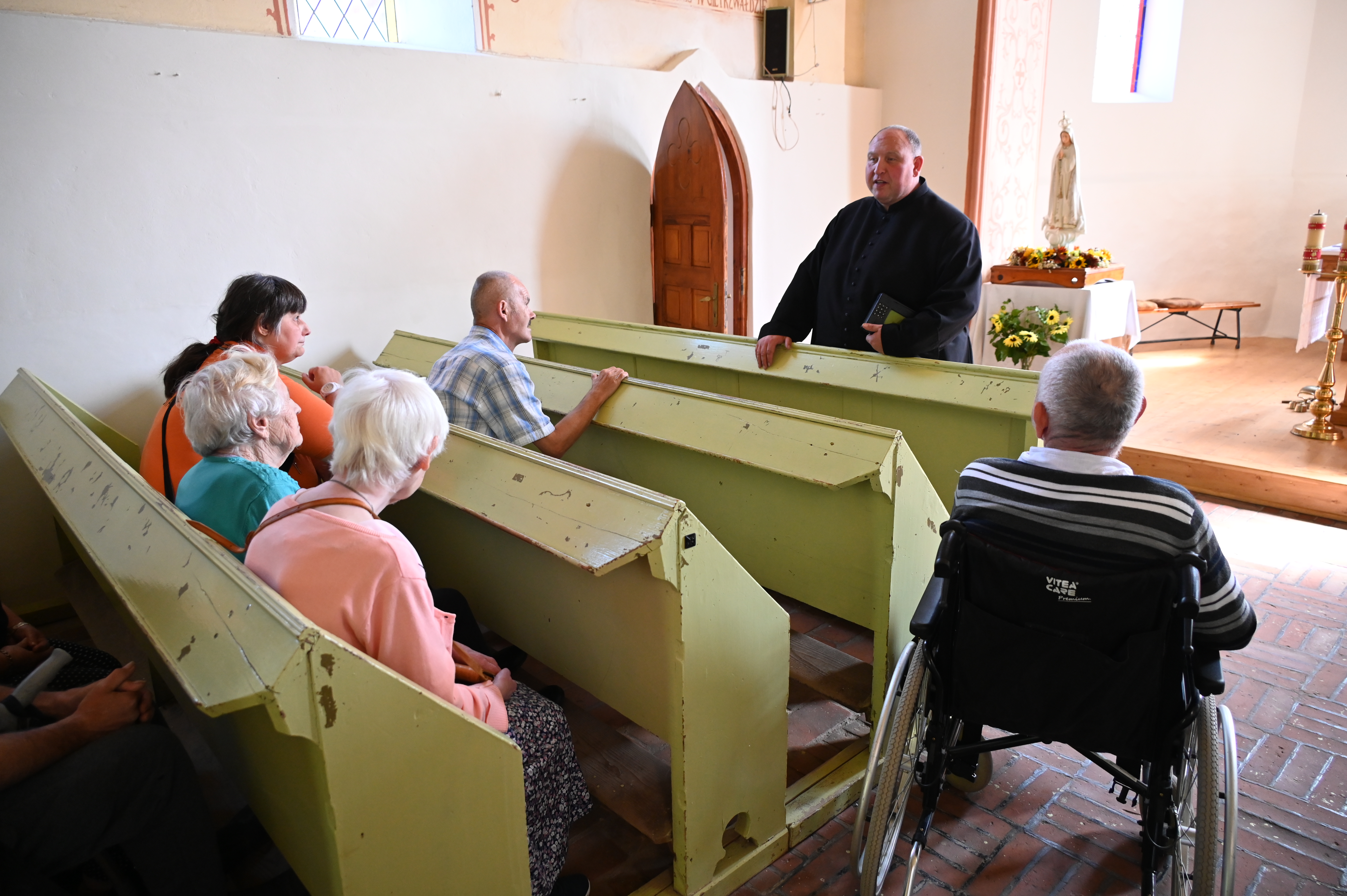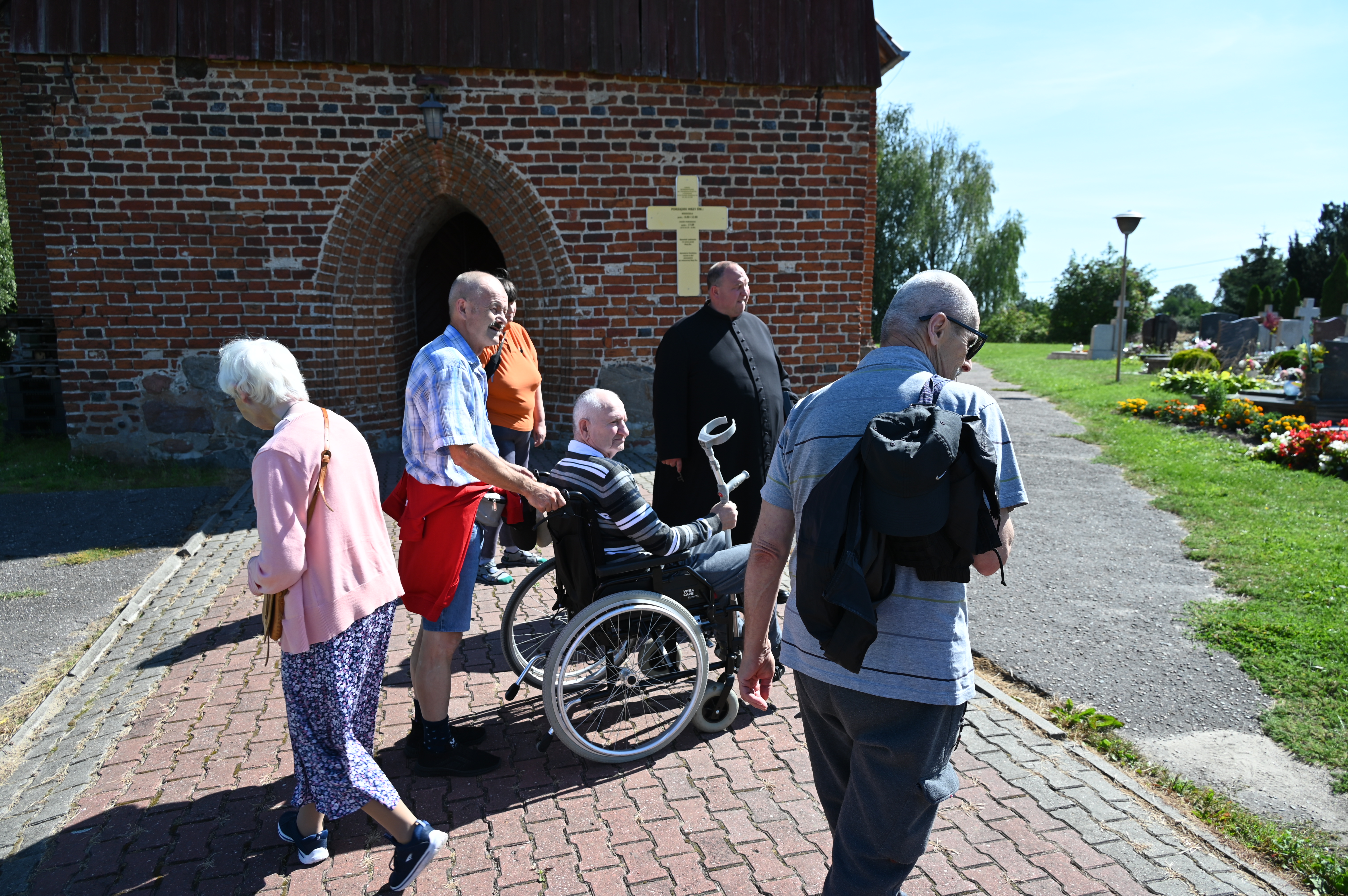 Mówi się, że nieszczęścia chodzą parami, czemu akurat zadaliśmy kłam podczas wyprawy datowanej na środę 14 sierpnia 2024 roku. Mieszkańcy Domu Pomocy Społecznej w Tolkmicku udali się w ten opromieniony słonecznym światłem dzień w podróż poznawczą i sentymentalną, przemierzając dwie historyczne krainy – płaskie jak stół, monotonne Żuławy Elbląskie i falujące pagórkami Prusy Górne, docierając do dwóch zabytkowych świątyń – gotyckiego kościoła w Kwietniewie i odbudowanego w 1865 roku filialnego kościoła w Świętym Gaju, spontanicznie witani przez parę buldogów belgijskich na kwietniewskiej plebani i przez nie mniej uroczą dwójkę kundelków na posesji nr 1 w Świętym Gaju. Poznaliśmy również dwie wykładnie wyjaśniające powstanie dziur w cegłach portalu kościoła w Kwietniewie – a to, że odprawiając pokutę wierni wyżłobili te otwory intensywnie żałując za grzechy, a to, że powstały one wtedy, gdy drążąc drewnianymi kołkami w murze uzyskiwało się żar do zapalenia świec, potem stawianych w kościele dla wzmocnienia przyniesionych intencji. Wszystkie nasze wrażenia układały się zatem parami, także przygotowane na nasz przyjazd pyszne drożdżowe bułeczki (jedne z twarogiem, drugie z dżemem), jednak żadnego nieszczęścia przez to nie zaznaliśmy, wprost przeciwnie – była to niezwykle udana, radosna i bardzo pouczająca wycieczka.