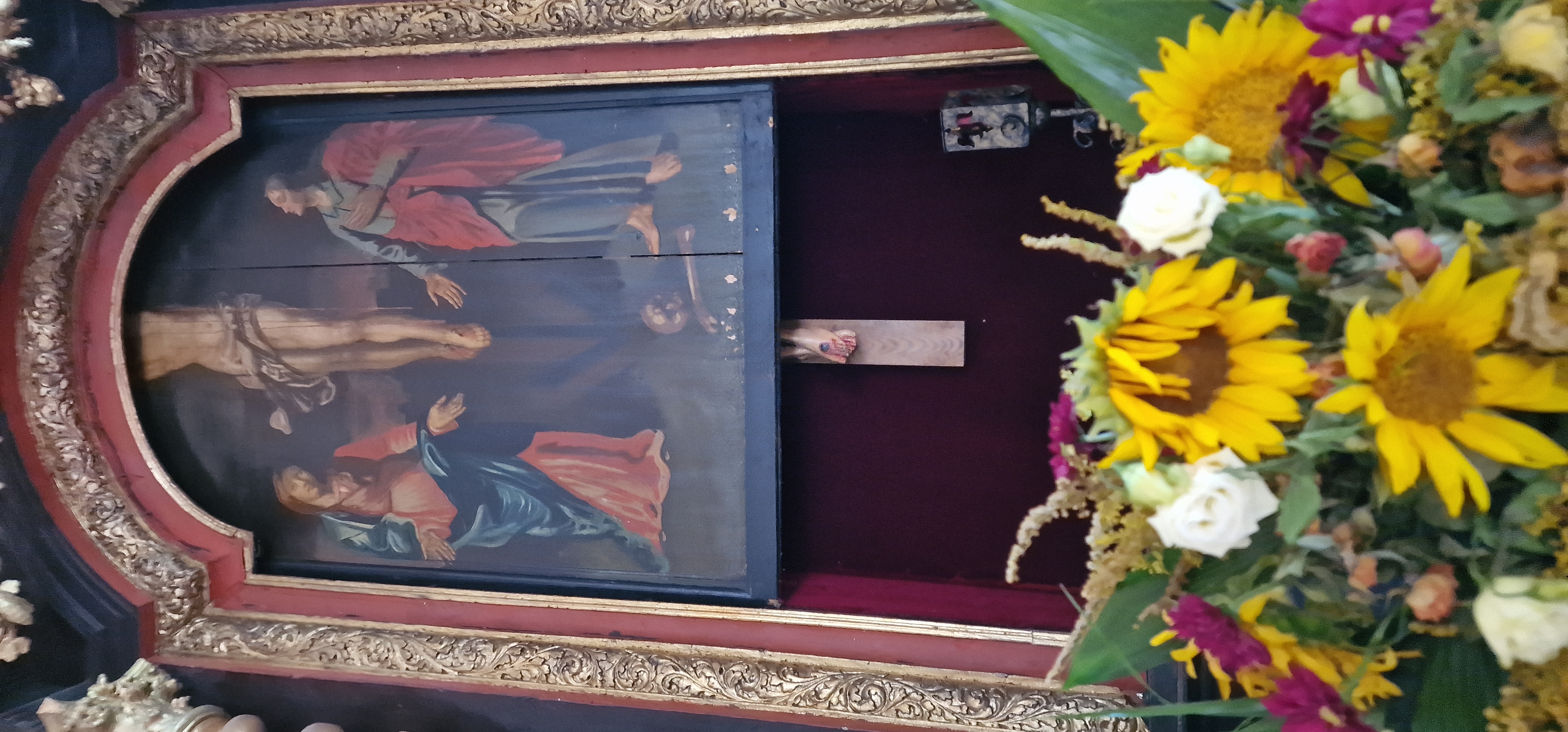 W większym i wspaniale wyposażonym kościele parafialnym w Kwietniewie słuchaliśmy opowieści o barokowej sztuce prezentującej się dumnie w postaci ołtarza głównego, ambony oraz dwupiętrowego chóru muzycznego z prospektem organowym. Wspaniałe te dzieła wymagają jednak renowacji, by w pełni zaprezentować gamę swoich walorów artystycznych. Na razie uwaga i praca opiekuna parafii skupia się na zabezpieczeniu zabytkowej budowli – tu, a także w Świętym Gaju, naprawiany jest dach, elewacje, instalacje i otoczenie. Ołtarz, w którym jeden z obrazów podnosi się odsłaniając niszę z krucyfiksem, prawdziwie nas zachwycił, ale przy okazji zdaliśmy przy nim egzamin ze znajomości symboliki związanej z atrybutami i imionami czterech Apostołów.